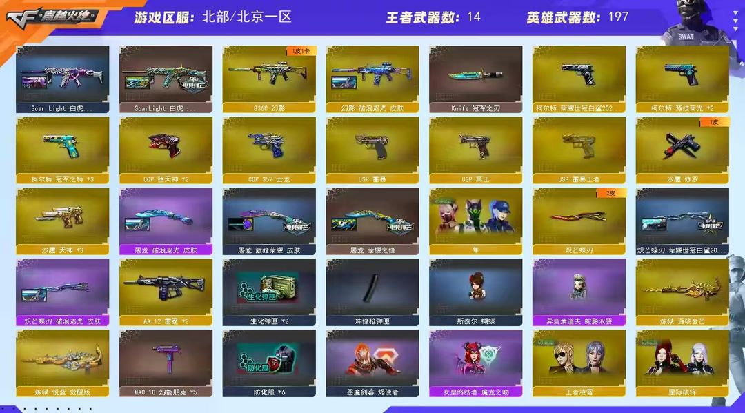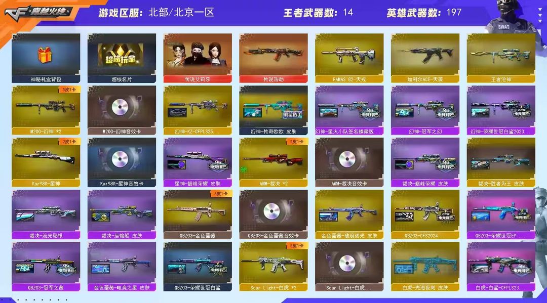 王者武器:炫金无影;斩神刀-雷暴王者;USP-雷暴王者;高爆手雷-雷暴王者;闪光弹-雷暴王者;王者冰锋;炼狱-悦蓝-觉醒版;王者冰魄-觉醒版;王者之魄-觉醒版;王者之魄;炫金天龙;烈龙-悦心-觉醒版;王者之怒 英雄武器:M200-幻神;Barrett-毁灭;传说浩劫;USP-冥王;柯尔特-冠军之特;Scar Light-白虎;FAMAS G2-天戎;COP-堕天神;幻灵之锋;烟雾弹-幻灵;高爆手雷-幻灵;闪光弹-幻灵;加利尔ACE-天袭;HK417-朱雀;Barrett-碧霄极光;M4A1-雷神;M4A1-黑龙;沙鹰-天神;M4A1-黑骑士;擎天;AK47-黑武士;烟雾弹-玄豹;闪光弹-玄豹;丛林匕首-玄豹;机械迷城-穹宇;AWM-裁决;AA-12-雷霆;柯尔特-荣耀世冠白鲨2023;G36C-幻影;AN94-超新星;AK12-天启;Kar98K-星神;黑骑士-海王;雷霆之锋;炽芒蝶刃;柯尔特-竞技荣光;烟雾弹-竞技荣光;闪光弹-竞技荣光;高爆手雷-竞技荣光;擎天-竞技荣光;QBZ03-金色蔷薇;闪光弹-云龙;烟雾弹-云龙;高爆手雷-云龙;云龙扇;QBZ03-云龙;COP 357-云龙