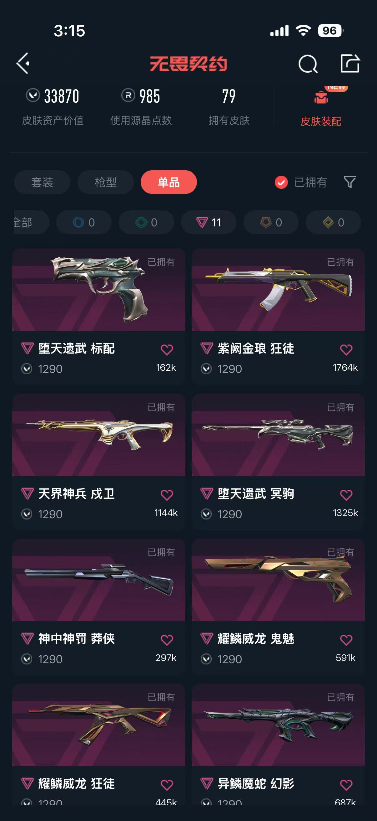 可排位 英雄29 武器皮肤数量79多热们皮肤 堕天大狙标配 威龙ak鬼魅 蛇年m4骇灵颗秒套猫猫奥丁