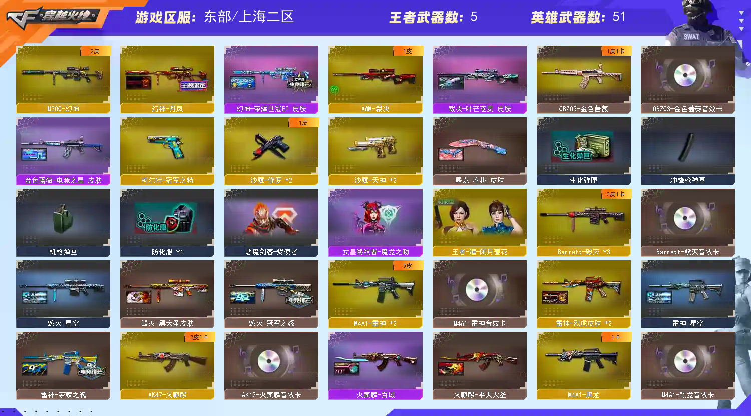 【M200-幻神+幻神-丹凤+荣耀世冠ep】【QBZ03-金色蔷薇+音效卡+电竞之星】【裁决+裁决-叶芒苍灵】【Barrett-毁灭+音效卡+毁灭-冠军之怒】【AK47-火麒麟+音效卡】【黑龙+音效卡】【M4A1-雷神+音效卡+烈虎+雷神-荣耀之魄】【黑骑士】【王者之武 王者之势 王者芳薇】【死神 】【6手枪 修罗*2 天神*2 柯尔特-冠军之特】【10近战 屠龙*2 麒麟刺*3 竞技荣光 】【手雷 雷霆雷 幻灵雷 竞技荣光 】【四防 王者瞳闭月羞花】【qbz音效卡 Barrett-毁灭音效卡 AK47-火麒麟音效卡 M4A1-雷神音效卡】;柯尔特-冠军之特,QBZ03-金色蔷薇,M200-幻神,