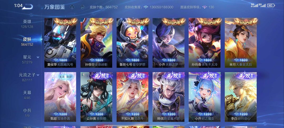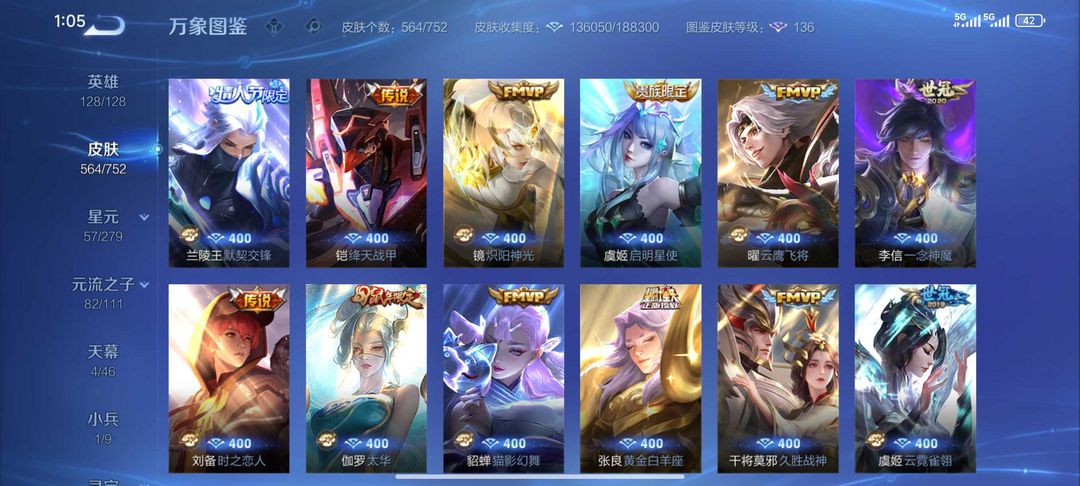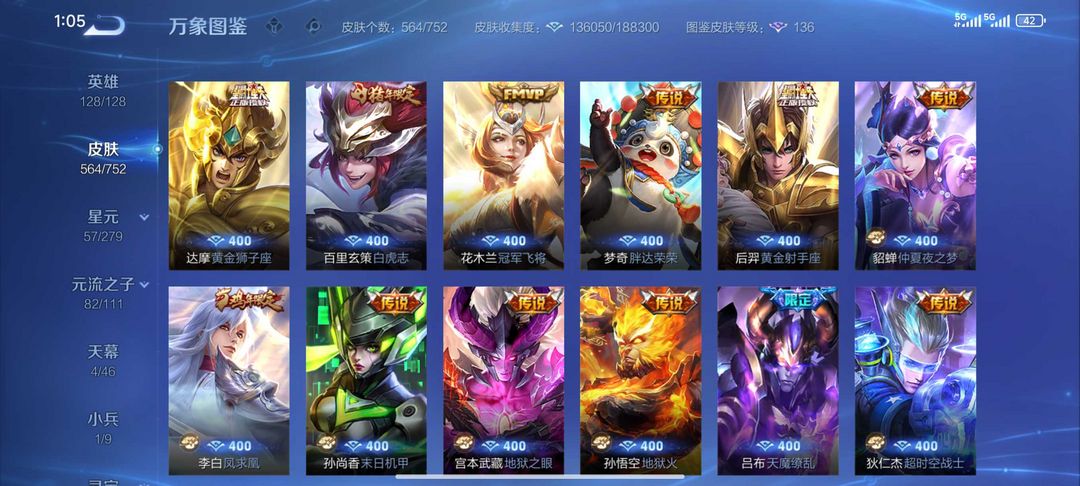 【非云直上】V10★皮肤榜一★539皮满典藏★鲁班时之奇旅会员★虞姬黛羽霜翎星元★吕布白金战神★全能大师★多金标★个性按键