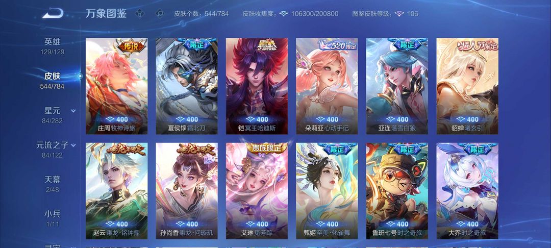 女生号 贵10 多皮肤多传说 别拿那些空号v10来比 要看性价比 貂蝉武则天夏侯惇孙悟空李白鲁班小乔荣耀水晶 妲己九尾无双皮肤 80个传说 473皮肤