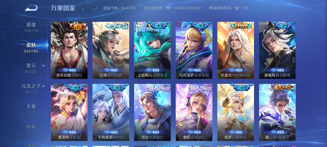 【非云直上】V10★皮肤榜一★539皮满典藏★鲁班时之奇旅会员★虞姬黛羽霜翎星元★吕布白金战神★全能大师★多金标★个性按键