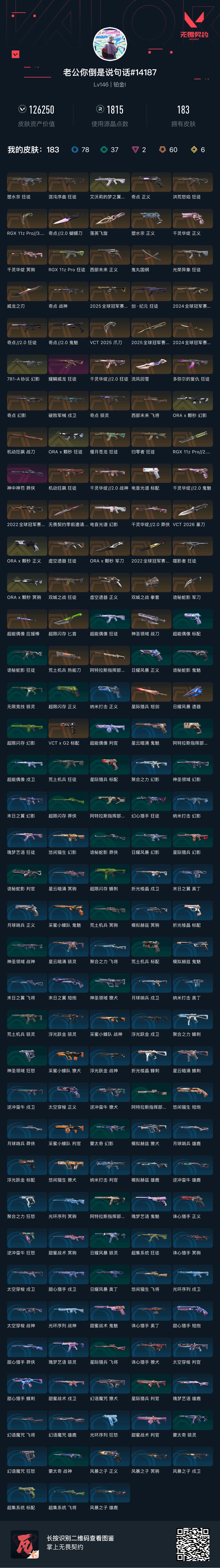 首页 > 租号大厅 > 无畏契约-wegame > wegame/wegame > 12W库存精品,24把刀26把ak,全VCT,22、24、25冠军,双城、颗秒、莲花2、奇点2套。