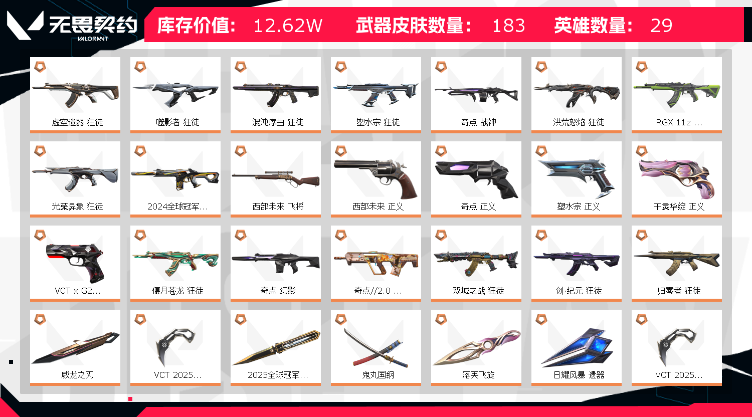 12W库存精品,24把刀26把ak,全VCT,22、24、25冠军,双城、颗秒、莲花2、奇点2套。