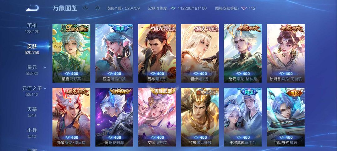 【非云直上】V10★皮肤榜一★539皮满典藏★鲁班时之奇旅会员★虞姬黛羽霜翎星元★吕布白金战神★全能大师★多金标★个性按键