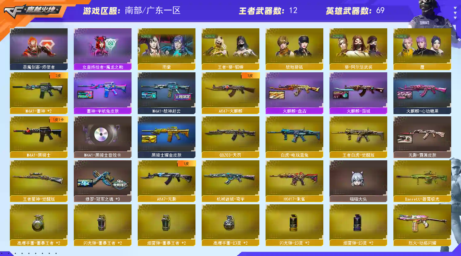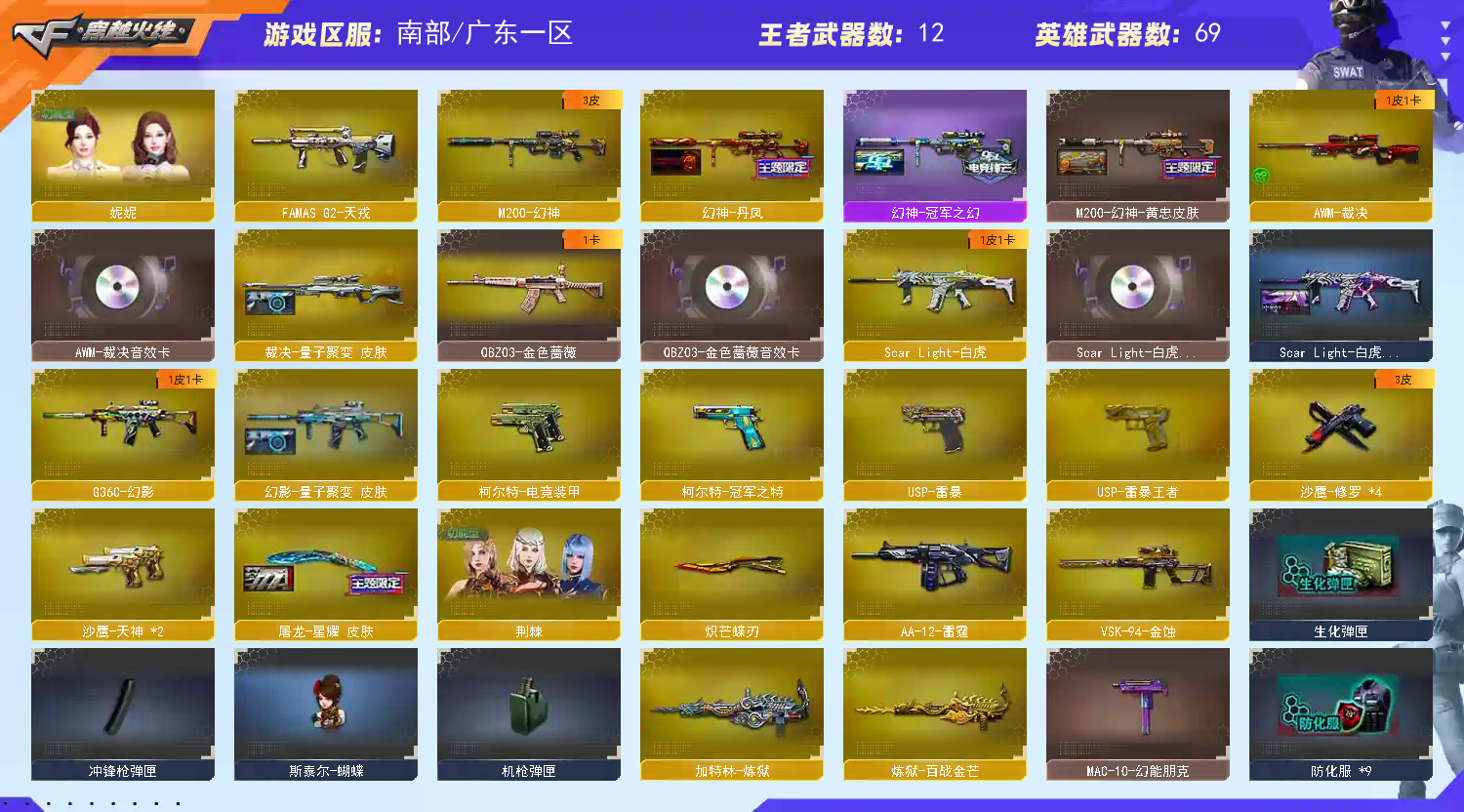 裁决三件套 ScarLight-白虎三件套 幻影三件套】【M200-幻神+幻神-丹凤+幻神-冠军之幻+幻神-黄忠】【王者星神】【98k量子之心】【G36C-幻影+音效卡+量子聚变】【王者白虎】【ScarLight-白虎+音效卡+暗星】【QBZ03-金色蔷薇+音效卡】【裁决+音效卡+量子聚变】【天戎】【AK47-火麒麟】【M4A1-雷神】【黑骑士+音效卡】【王者之魄 王者之戮】【无影 hk417-朱雀】【11手枪 修罗*4 天神*2 usp雷暴 柯尔特-冠军之特 usp雷暴王者】【15近战 屠龙*2 擎天 幻灵之锋 炽芒蝶刃蝴蝶刀 云龙扇 王者之锋 】【手雷 幻灵雷 量子之心 雷暴王者 】【四防 妮妮 王者葵貂禅 】【幻影音效卡 ScarLight-白虎音效卡 裁决音效卡;USP-雷暴,USP-雷暴王者,柯尔特-冠军之特,炽芒蝶刃,妮妮,QBZ03-金色蔷薇,G36C-幻影,