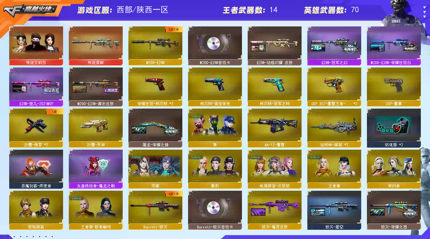 ★收藏好评!★ ━━━━━━━━ 由于异地登录保护机制,部分客户在使用客户端自动上号时会出现密码错误,注意本号密码不会错误 ,请多尝试5-6次!本账号已经过虚拟财产,请各位科技大神高抬贵手。请素质租号,文明游戏,谢谢大家配合!!! 账号装备;USP-雷暴,荣耀世冠-柯尔特,柯尔特-冠军之特,隼,电竞教官-云悠悠,传说艾莉莎,M200-幻神,