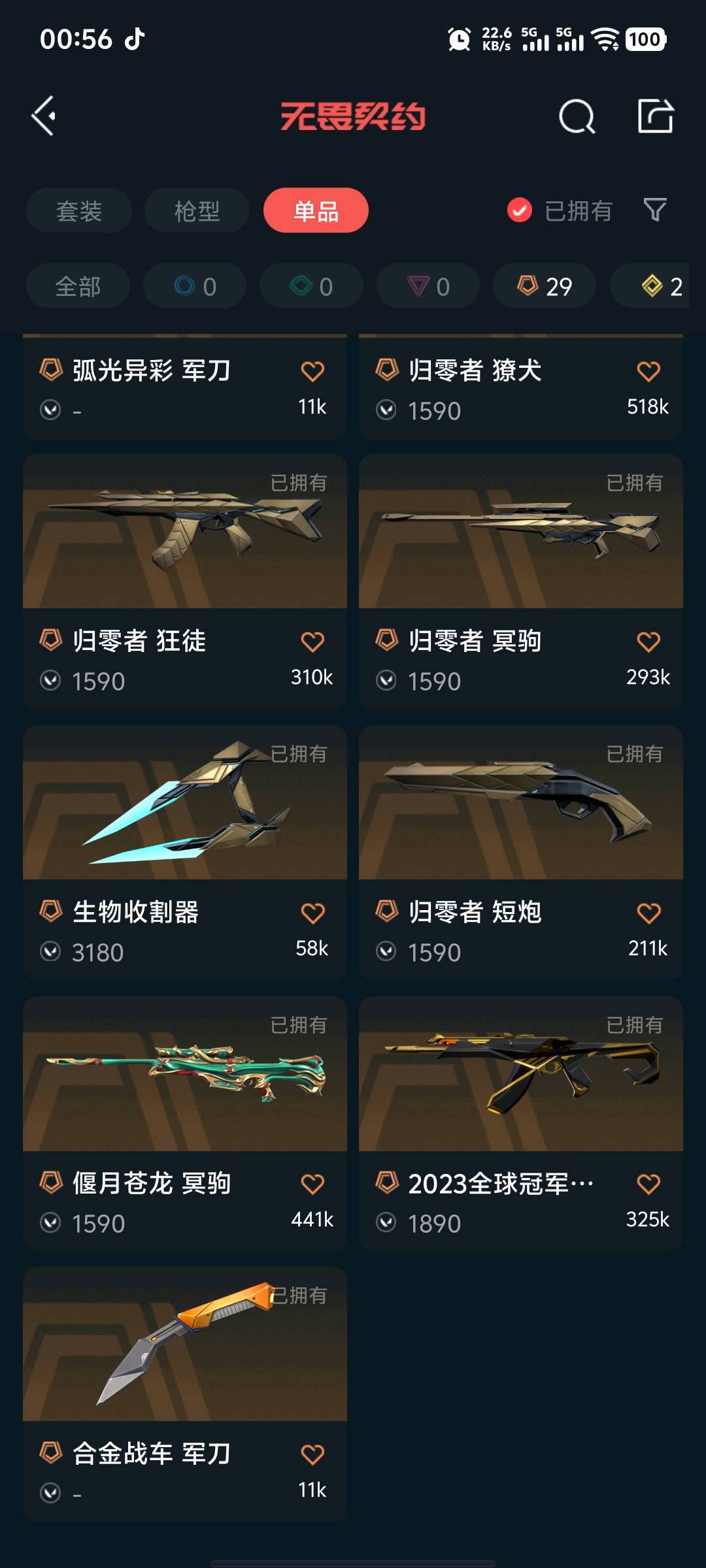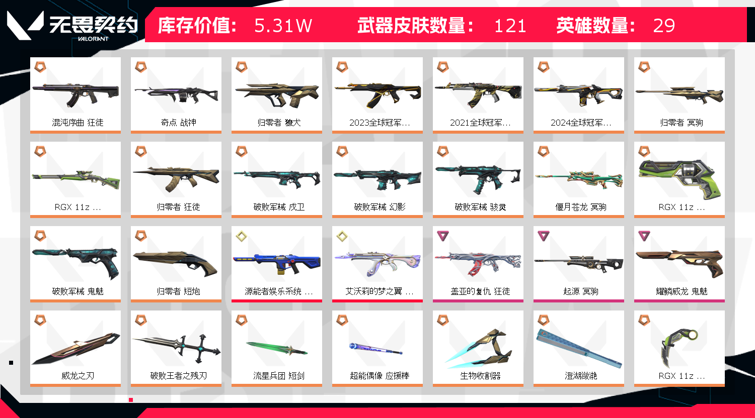 允许 英雄28 武器皮肤数量121;奇点 战神,威龙之刃,归零者 獠犬,盖亚的复仇 狂徒,源能者娱乐系统 幻影,混沌序曲 狂徒,2023全球冠军赛 狂徒,