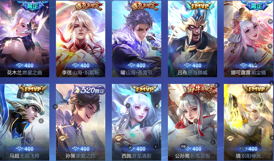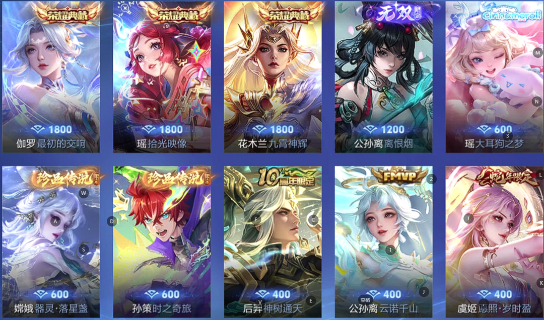 v10、12典藏530皮、【伽罗-沧流箭】云缨-神骥·越千峰、马超无双飞将、韩信典藏、马可深海之熄、青丘·九尾、枫霜尽、绯月行、前尘镜、至尊宝、天魔缭乱