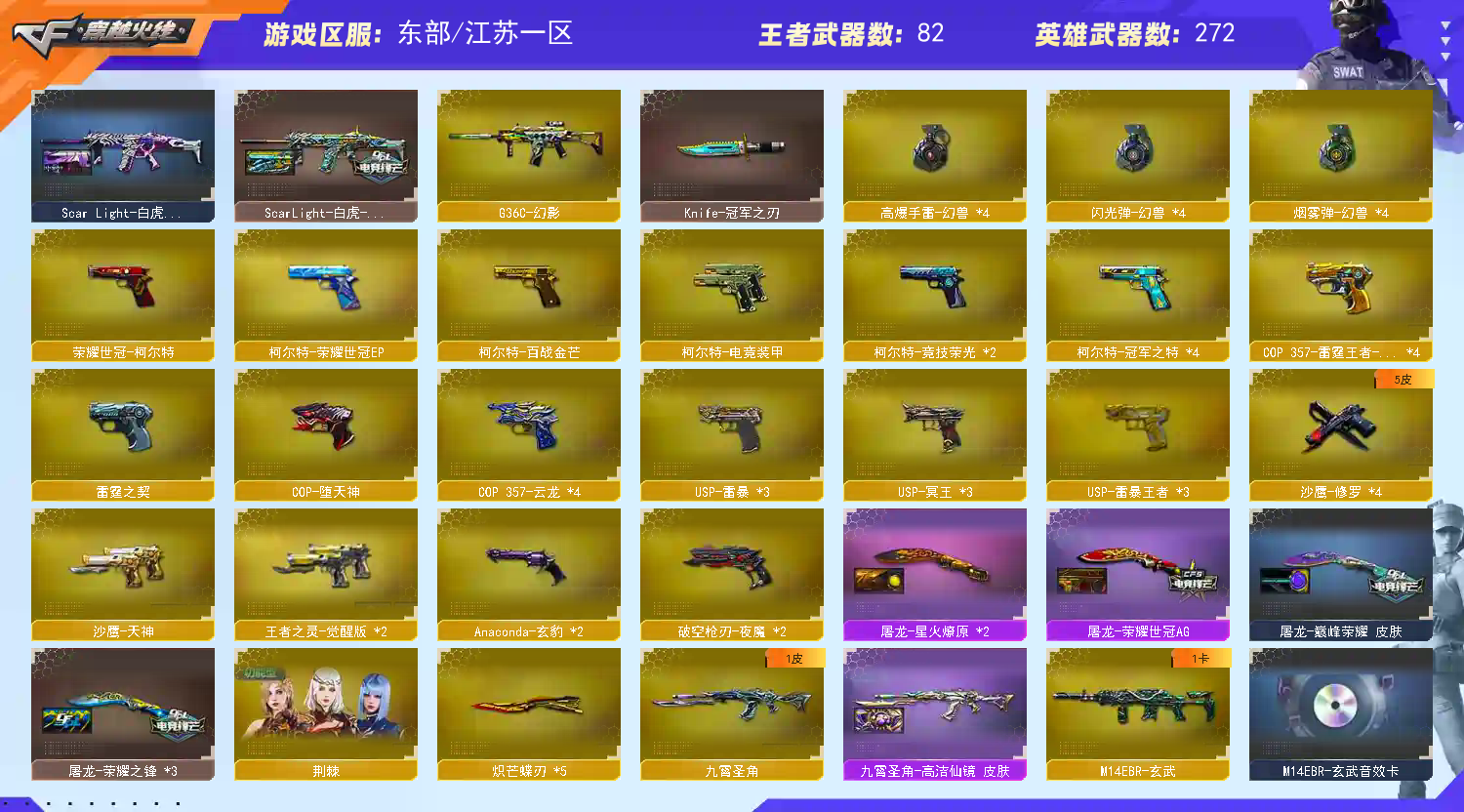 东部江苏一区【幻神光海夜岚 8传说 幻兽套 38把质量副手 5把炽芒蝶刃】【4幻兽 1黄金柯尔特 3把USP王者雷暴 1把EP柯尔特 4冠军之特 4把COP雷霆王者 3把冥王 3把雷暴 】【传说影煞 传说星骇 传说幽瞳 传说圣谕 法玛斯 加利尔 九霄圣角 圣角神刃 G36C幻影 】 幻神卡 白虎卡 裁决卡 QBZ卡等354V;USP-雷暴,USP-雷暴王者,荣耀世冠-柯尔特,传说幽冥,柯尔特-冠军之特,炽芒蝶刃,Knife-冠军之刃,