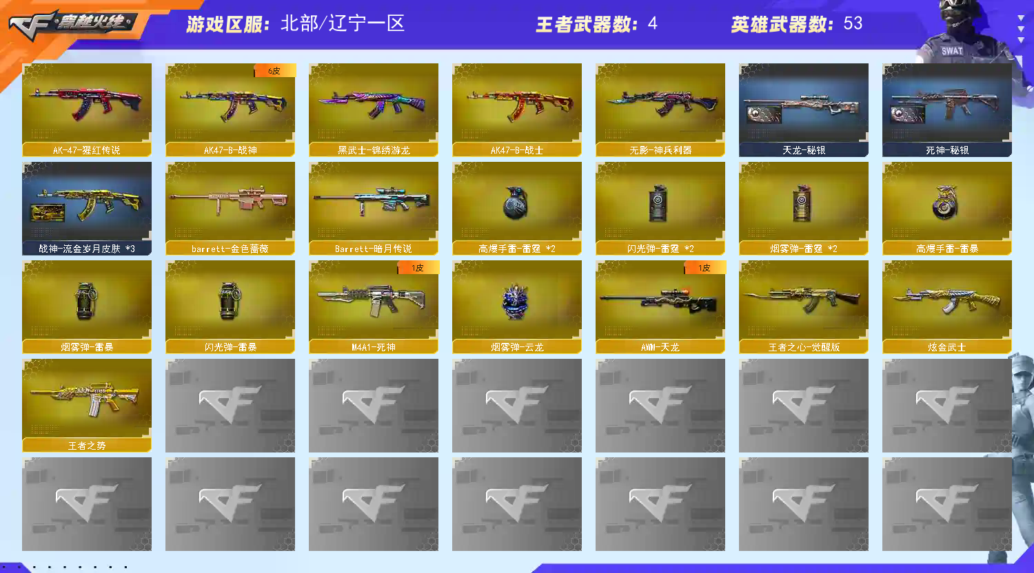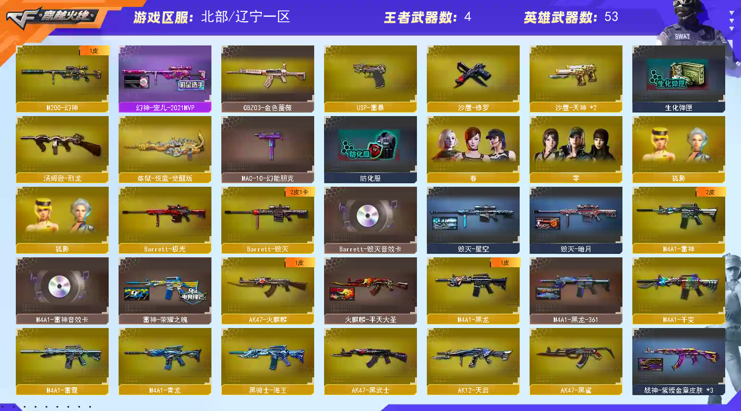 M4A1-青龙,M200-幻神,QBZ03-金色蔷薇,死亡之眼,沙鹰-修罗,汤姆逊-烈龙,USP-雷暴【王者炫金武器】:王者之势,炫金武士,炫金修罗【音效卡】:Barrett-毁灭,M4A1-雷神【皮肤】:幻神-宠儿-2021MVP,火麒麟-平天大圣,毁灭-暗月,毁灭-星空,毁灭-AG-CFPLS15冠军,雷神-荣耀之魄,M4A1-黑龙-361,天龙-秘银,火麒麟-雷神,死神-秘银,战神-紫绶金章,战神-流金岁月【角色】:春,狐影,零,青霞仙子,奇洋探员,空,暗夜-X,飞虎队-X,风暴女,嘉年华灵狐,娟娟,兰-新年限定,灵狐者-X,灵狐者-黄金海岸,麻雀,潘多拉-X【人偶武器】:夺魂,迷你裂空之翼,迷你波特博士,迷你牛牛,迷你艾比,生化手雷-机甲核心,深渊终结者手雷,闪光弹-小乔【暴走生化】:超级对讲机,死亡之眼【挑战大师】:AK47-冰龙粉碎者,冰龙粉碎者-白马银枪,阐释者III,激光毁灭者III,机甲撕裂者III,神圣爆裂者III,神圣爆裂者-末日III,VEPR-12-金魔【英雄级武器】:AK47-火麒麟,AK47-黑武士,AK12-天启,AK47-黑鲨,AWM-天龙,Barrett-毁灭,Barrett-极光,幻灵之锋,龙啸,M4A1-千变,M4A1-黑龙,M4A1-雷神,M4A1-死神,M4A1-雷霆,M200-幻神,尼泊尔-雷霆【其他武器】:火麒麟-雷神,源·HK417-朱雀,魂·QBZ03-金色蔷薇-萌杀,AWM-裁决-百城联赛天津,魂·裁决-羽掣,魂·毁灭-神秘黑洞,魂·麒麟刺-神秘黑洞【道具】:奇洋探员-海龟背包,战舰背包,炫彩背包,热带奇洋炫彩背包,超级背包,绿色巨人,生化弹匣,夺命之镰,防化服,金色流光-枪王排位,星辰流光-枪王排位,枪王排位28赛季金色流光,热带奇洋表情,斯沃特表情,防弹头盔,防弹衣【特殊枪械】:1烈龙;USP-雷暴,QBZ03-金色蔷薇,M200-幻神,