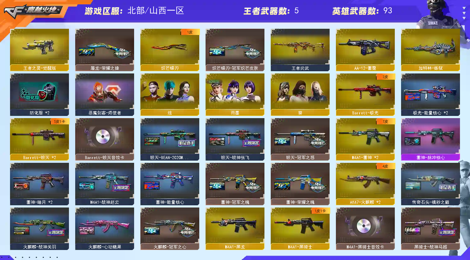 【幻神6皮】【死亡之眼】【雷霆套装X6套】【幻兽套装X4套】【传说艾莉莎】【神威天绫】【QBZ95-幻兽】【破空枪刃】【沙鹰-幻兽】【高爆手雷-幻兽】【闪光弹-幻兽】【烟雾弹-幻兽】【M200-幻神】【幻神-YZK-2024MVP 皮肤】【幻神-KZ-CFPLS25冠军 皮肤】【幻神-宠儿-2021MVP】【幻神-巅峰荣耀】【幻神-周瑜皮肤】【M200-幻神-黄忠皮肤】【Kar98K-星神】【星神-拼搏 皮肤】【星神-傲竹金蛇 皮肤】【AWM-裁决】【AWM-裁决音效卡】【裁决-胜者为王 皮肤】【Scar Light-白虎】【白虎-量子聚变 皮肤】【白虎-梅雀衔霜 皮肤】【Scar Light-白虎音效卡】【QBZ03-金色蔷薇】【QBZ03-冠军之薇】【QBZ03-巅峰荣耀皮肤】【QBZ03-天罚】【加利尔ACE-天袭】【FAMAS G2-天戎】【G36C-幻影】【幻影-量子聚变 皮肤】【G36C-幻影音效卡】【M4A1-雷霆】【HK417-朱雀】【USP-冥王】【柯尔特-冠军之特】【柯尔特-无冕之王】【破空枪刃】【沙鹰-幻兽】【雷霆之契】【炽芒蝶刃】【炽芒蝶刃-冠军炽芒皮肤】【加特林-炼狱】【死亡之眼】【传说艾莉莎】【葵】【雨墨】【炫】【M4A1-雷神】【雷神-荣耀之魄】【雷神-冠军之魄】【M4A1-战神赵云】【雷神-脉冲核心】【雷神-能量核心】【雷神-暗月】【AK47-火麒麟】【火麒麟-冠军之心】【传奇石头-横秒之巅】【火麒麟-战神关羽】【火麒麟-心动糖果】【M4A1-黑骑士】【黑骑士-战神马超】【M4A1-黑骑士音效卡】【M4A1-黑龙】【Barrett-毁灭】【毁灭-冠军之怒】【毁灭-BEAN-2020MVP】【毁灭-战神张飞】【Barrett-毁灭音效卡】;柯尔特-无冕之王,柯尔特-冠军之特,炽芒蝶刃,传说艾莉莎,QBZ03-金色蔷薇,G36C-幻影,M200-幻神,