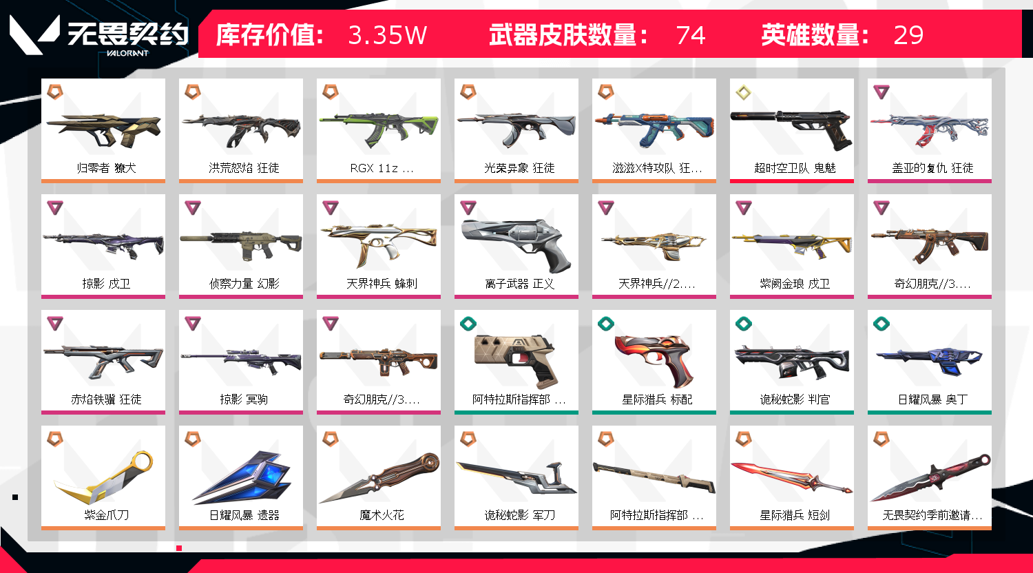 允许 英雄28 武器皮肤数量74;紫金爪刀,归零者 獠犬,盖亚的复仇 狂徒,掠影 戍卫,洪荒怒焰 狂徒,侦察力量 幻影,RGX 11z Pro 狂徒,