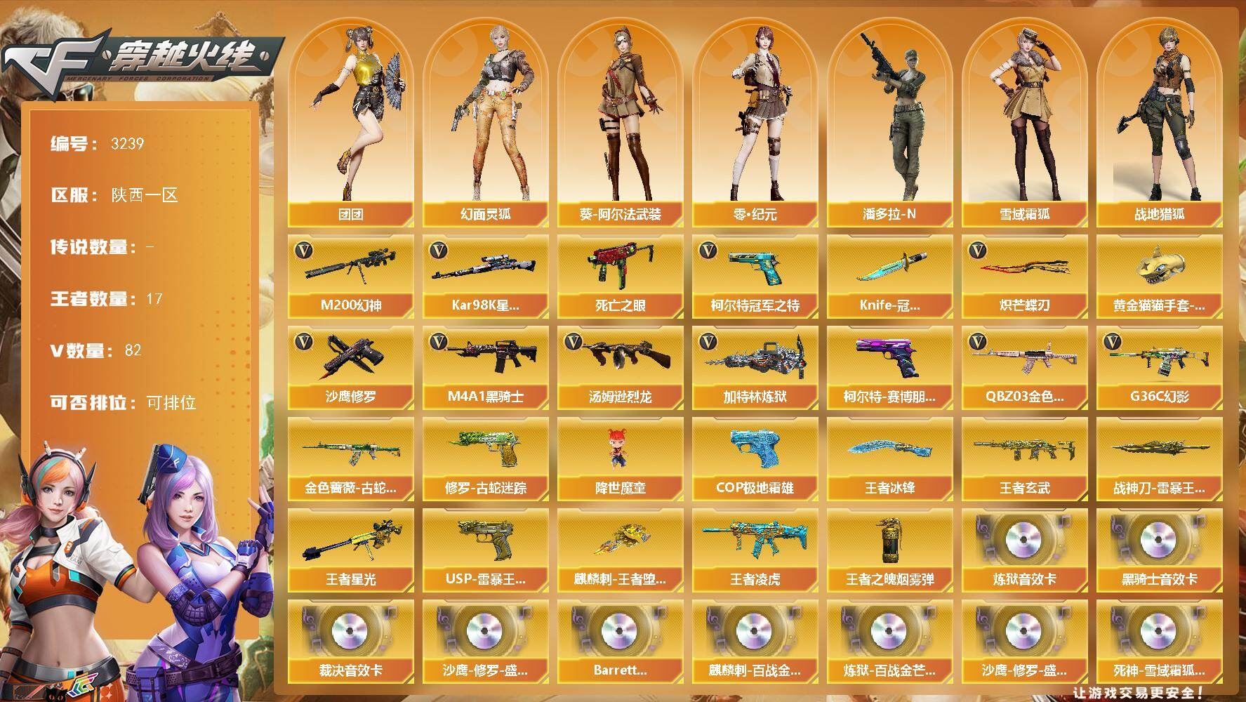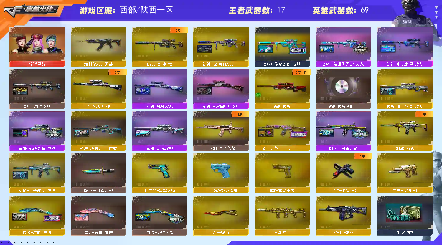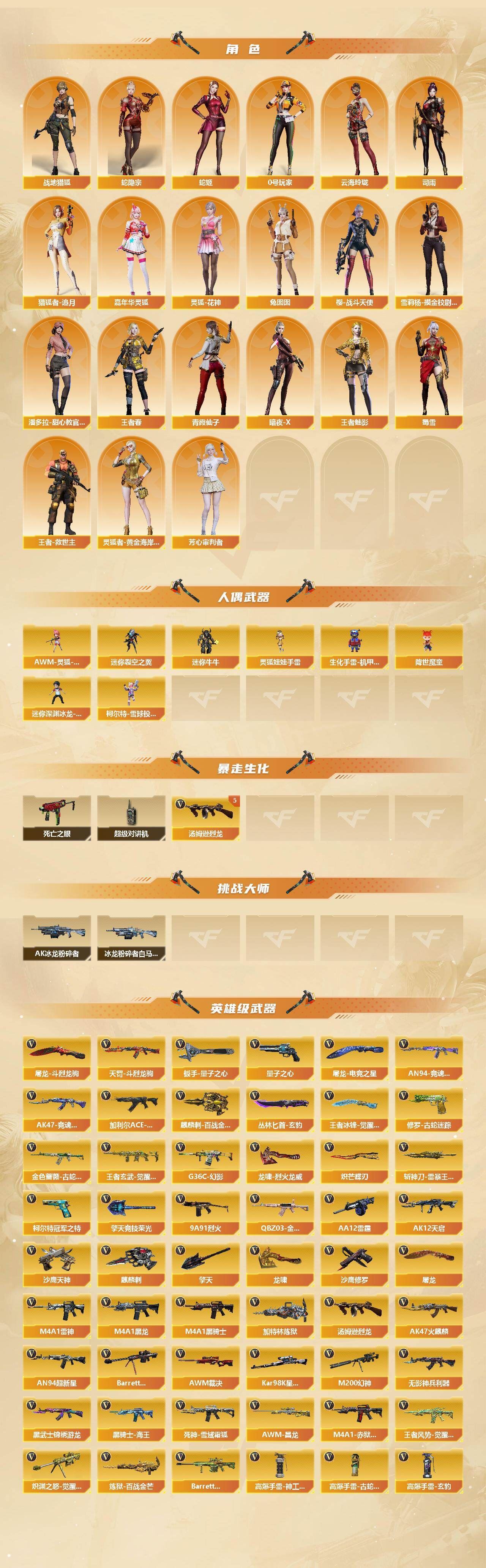 【传说角色】:传说星骇四防【热门武器】:G36C-幻影,QBZ03-金色蔷薇,M200-幻神*2,金色蔷薇-古蛇迷踪,修罗-古蛇迷踪,死亡之眼,柯尔特-冠军之特,Kar98K-星神,M4A1-黑骑士,汤姆逊-烈龙*5,加特林-炼狱,降世魔童,沙鹰-修罗*3,柯尔特-赛博朋克,Knife-冠军之刃,炽芒蝶刃,黄金猫猫手套-白鲨,COP 357-极地霜雄【王者炫金武器】:王者玄武,王者凌虎,王者星光,USP-雷暴王者,斩神刀-雷暴王者,麒麟刺-王者堕天神,王者冰锋,王者之魄烟雾弹【音效卡】:M4A1-黑骑士音效卡,AWM-裁决音效卡,加特林-炼狱音效卡,沙鹰-修罗-盛典舞曲音效卡*2,Barrett-碧霄极光音效卡,麒麟刺-百战金芒-盛典舞曲音效卡,炼狱-百战金芒-庆典舞曲音效卡,死神-雪域霜狐-怀旧音效卡,AWM-昌龙-怀旧音效卡【皮肤】:幻神-周瑜皮肤,幻神-传奇欧欧 皮肤,幻神-荣耀世冠EP 皮肤,幻神-KZ-CFPLS25冠军 皮肤,幻神-电竞之星 皮肤,白虎-巅峰荣耀 皮肤,QBZ03-冠军之薇,金色蔷薇-Heartshot皮肤,裁决-流光秘银,AWM-裁决-百城联赛天津皮肤,裁决-巅峰荣耀 皮肤,裁决-胜者为王 皮肤,裁决-量子聚变 皮肤,星神-璀璨皮肤,星神-黯钢战甲 皮肤,雷神-荣耀之魄,雷神-机甲刑天皮肤,雷神-维纳斯皮肤,雷神-化蛇 皮肤,M4A1-再燃火线,火麒麟-轻羽皮肤,火麒麟-百城,AK47-火麒麟-百城23冠军皮肤,毁灭-暗月,毁灭-荣耀之怒,毁灭-神秘黑洞皮肤,毁灭-百城浙江 皮肤,毁灭-虹光风暴 皮肤,毁灭-英雄计划 皮肤,黑龙-墨子皮肤,黑骑士-冠军之势,黑骑士-破界 皮肤,天启-黯钢战甲 皮肤,HK417-朱雀-掌火灵橙 皮肤,幻影-量子聚变 皮肤,烈火-动感闪耀 皮肤,炼狱-玩具枪皮肤,修罗-星空,修罗-冠军之魂,天神-春花弄影 皮肤,屠龙-荣耀之锋,屠龙-星耀 皮肤,屠龙-春桃 皮肤,轻型军用手斧-再燃火线,龙啸-幻灵之哮 皮肤,擎天-冠军之击,麒麟刺-量子聚变 皮肤【角色】:司雨,零·纪元,战地猎狐,王者春,王者-魅影,王者-救世主,雪域霜狐,蛇隐宗,云海玲珑,葵-阿尔法武装,幻面灵狐,暗夜-X,芳心审判者,嘉年华灵狐,猎狐者-追月,0号玩家,灵狐-花神,灵狐者-黄金海岸,潘多拉-甜心教官,青霞仙子,蛇姬,蜀雪,兔囡囡,雪莉杨-摸金校尉,樱-战斗天使,潘多拉-N,团团【人偶武器】:柯尔特-雪球投手,AWM-灵狐-15周年嘉年华,迷你裂空之翼,迷你牛牛,生化手雷-机甲核心,迷你深渊冰龙-王绿豆,灵狐娃娃手雷*2,降世魔童【暴走生化】:死亡之眼,超级对讲机【挑战大师】:AK47-冰龙粉碎者,冰龙粉碎者-白马银枪【英雄级武器】:AK47-火麒麟,M4A1-黑龙,M4A1-雷神*2,M4A1-黑骑士,AK12-天启,AN94-超新星,无影-神兵利器,G36C-幻影,黑武士-锦绣游龙,金色蔷薇-古蛇迷踪,死神-雪域霜狐,QBZ03-金色蔷薇,9A91-烈火,黑骑士-海王,王者风势-觉醒版,王者玄武-觉醒版,加利尔ACE-天袭,HK417-朱雀-电竞之星,机械迷城-穹宇,天罚-斗烈龙驹,Barrett-毁灭*2,AWM-裁决,M200-幻神*2,Kar98K-星神,炽渊之怒-觉醒版,Kar98K-量子之心,加特林-炼狱,炼狱-百战金芒,汤姆逊-烈龙*5,AA-12-雷霆,沙鹰-修罗*3,沙鹰-天神*4,柯尔特-冠军之特,Anaconda-量子之心,修罗-古蛇迷踪,屠龙,龙啸,擎天,麒麟刺,擎天-竞技荣光,炽芒蝶刃,麒麟刺-百战金芒,丛林匕首-玄豹,王者冰锋-觉醒版,斩神刀-雷暴王者-觉醒版,扳手-量子之心,屠龙-电竞之星,屠龙-斗烈龙驹,龙啸-烈火龙威*2,高爆手雷-神工天巧,高爆手雷-古蛇迷踪,高爆手雷-玄豹,高爆手雷-雷暴王者*2,高爆手雷-量子之心,闪光弹-神工天巧,闪光弹-雷暴王者*3,闪光弹-量子之心,烟雾弹-神工天巧,烟雾弹-古蛇迷踪,烟雾弹-雷暴王者*2,烟雾弹-荣耀世冠EP,烟雾弹-量子之心,M4A1-赤狱骑士,AK47-竞魂无影,AN94-竞魂超新星,AWM-昌龙,Barrett-碧霄极光【道具】:BS战队炫彩背包,CFS限定背包,EP战队炫彩背包,云山科技背包,亚洲杯纪念炫彩背包,冰冰企背包,古蛇迷踪炫彩背包,炫彩背包-诺拉,百战金芒炫彩背包,超级背包,雪域霜狐炫彩背包,女皇终结者-魔龙之吻,救世主-黑桃战神,绿色巨人,灵魂忍者*2,变异宝贝,迷雾幽灵*2,生化弹匣,夺命之镰,防化服*4,巅峰赛先锋-金色流光,流光-鎏金之域,流光-再燃火线,枪王排位28赛季金色流光,枪王排位29赛季金色流光,语音特效;USP-雷暴王者,柯尔特-冠军之特,炽芒蝶刃,Knife-冠军之刃,传说星骇,QBZ03-金色蔷薇,G36C-幻影,