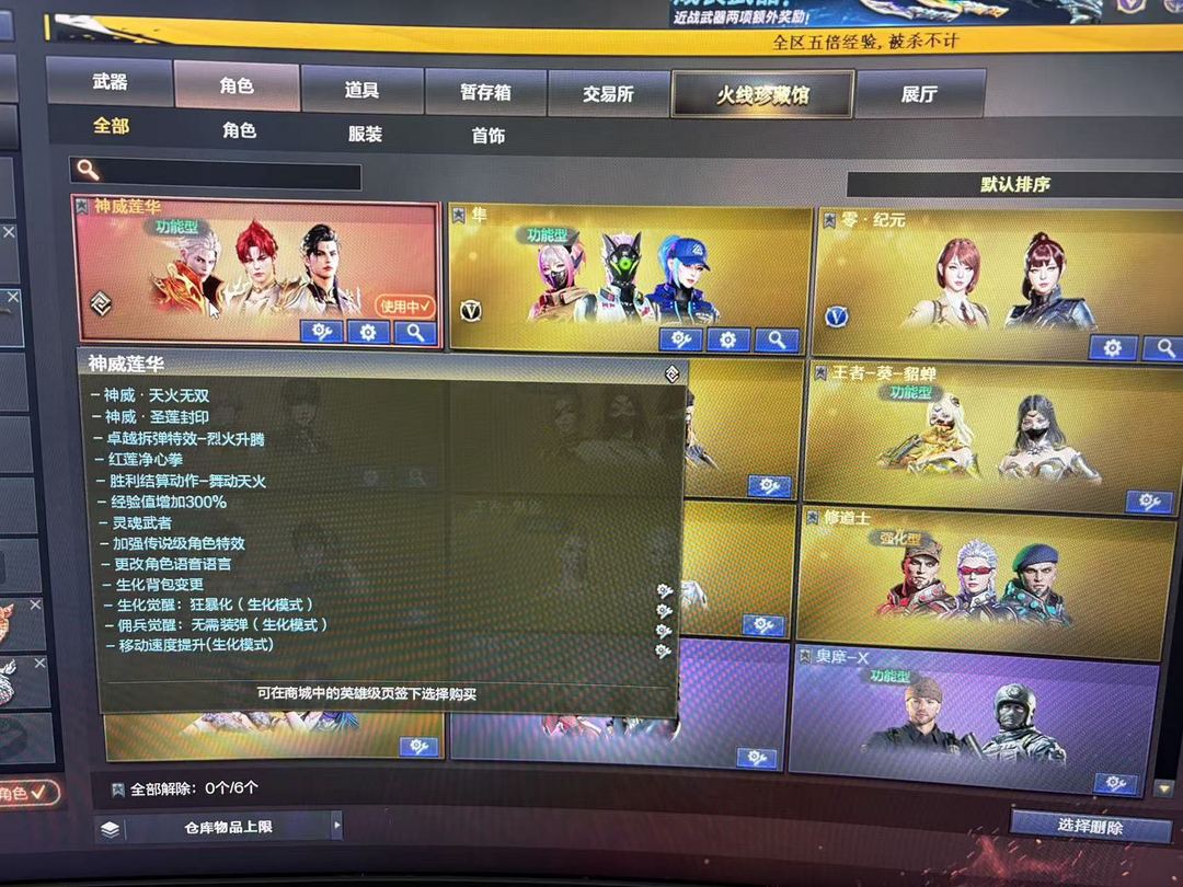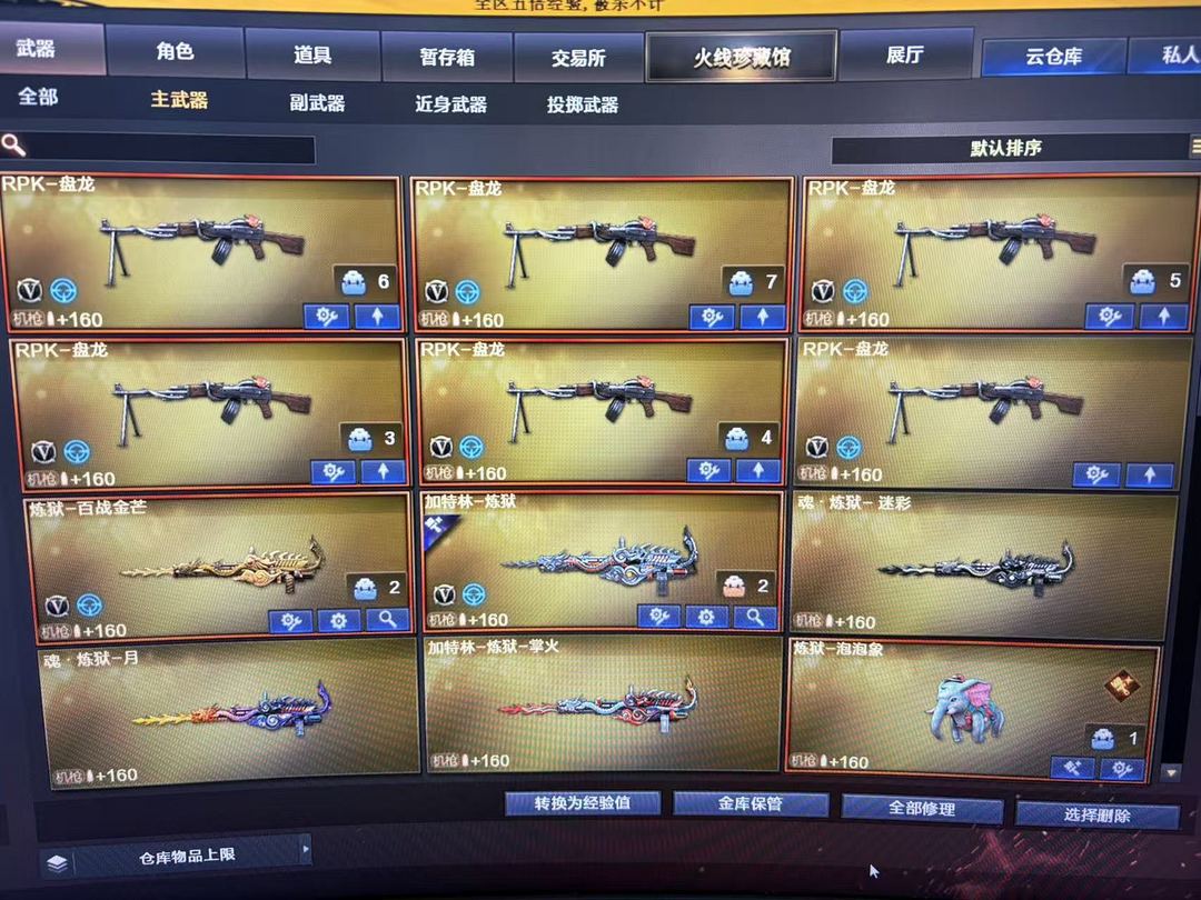 神威莲花4防@6烈6盘@清道夫小人枪@炼狱泡泡象(已赋予)@蝴蝶刀@幻神、王者风神.传说神灵