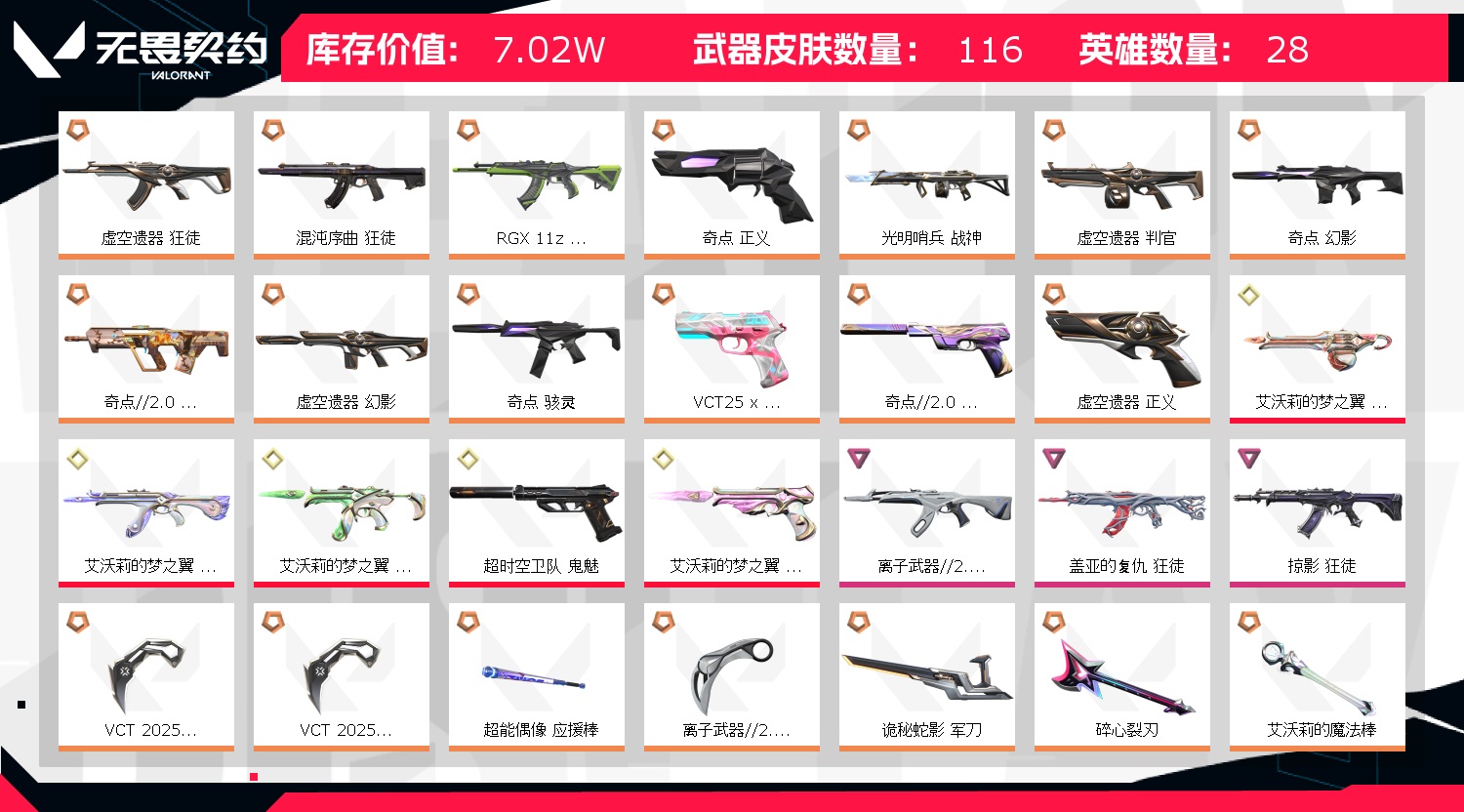 开挂导致被封号报警起诉处理,封号押金不退,号上点券和r点不能动;艾沃莉的梦之翼 奥丁,VCT 2025 爪刀,盖亚的复仇 狂徒,虚空遗器 狂徒,掠影 狂徒,侦察力量 幻影,RGX 11z Pro 狂徒,