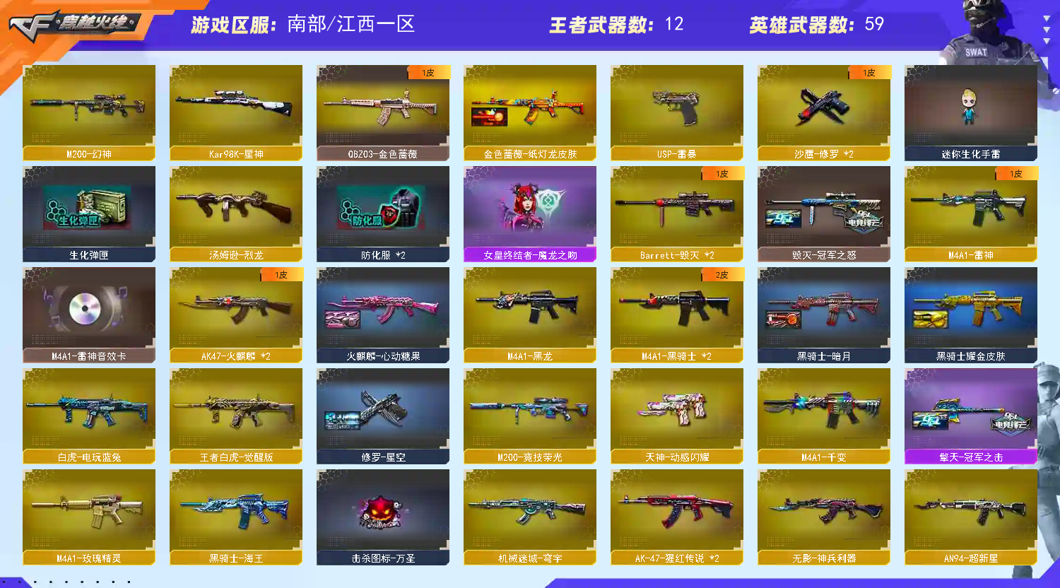 【M200-幻神】【M200-竞技荣光】【Kar98K-星神】【王者白虎】【QBZ03-金色蔷薇】【Barrett-毁灭+毁灭-冠军之怒】【AK47-火麒麟】【黑龙】【M4A1-雷神+音效卡】【黑骑士】【王者之魄 王者之势 王者之戮】【死神 超新星 玫瑰精灵】【4手枪 修罗*2 usp雷暴 】【11近战 屠龙 龙啸 擎天*2 麒麟刺 斩神刀雷暴 竞技荣光*2 王者之啸】【手雷 雷暴雷 竞技荣光 】【角色 修道士 乔伊教练】【M4A1-雷神音效卡】;USP-雷暴,QBZ03-金色蔷薇,M200-幻神,Kar98K-星神,