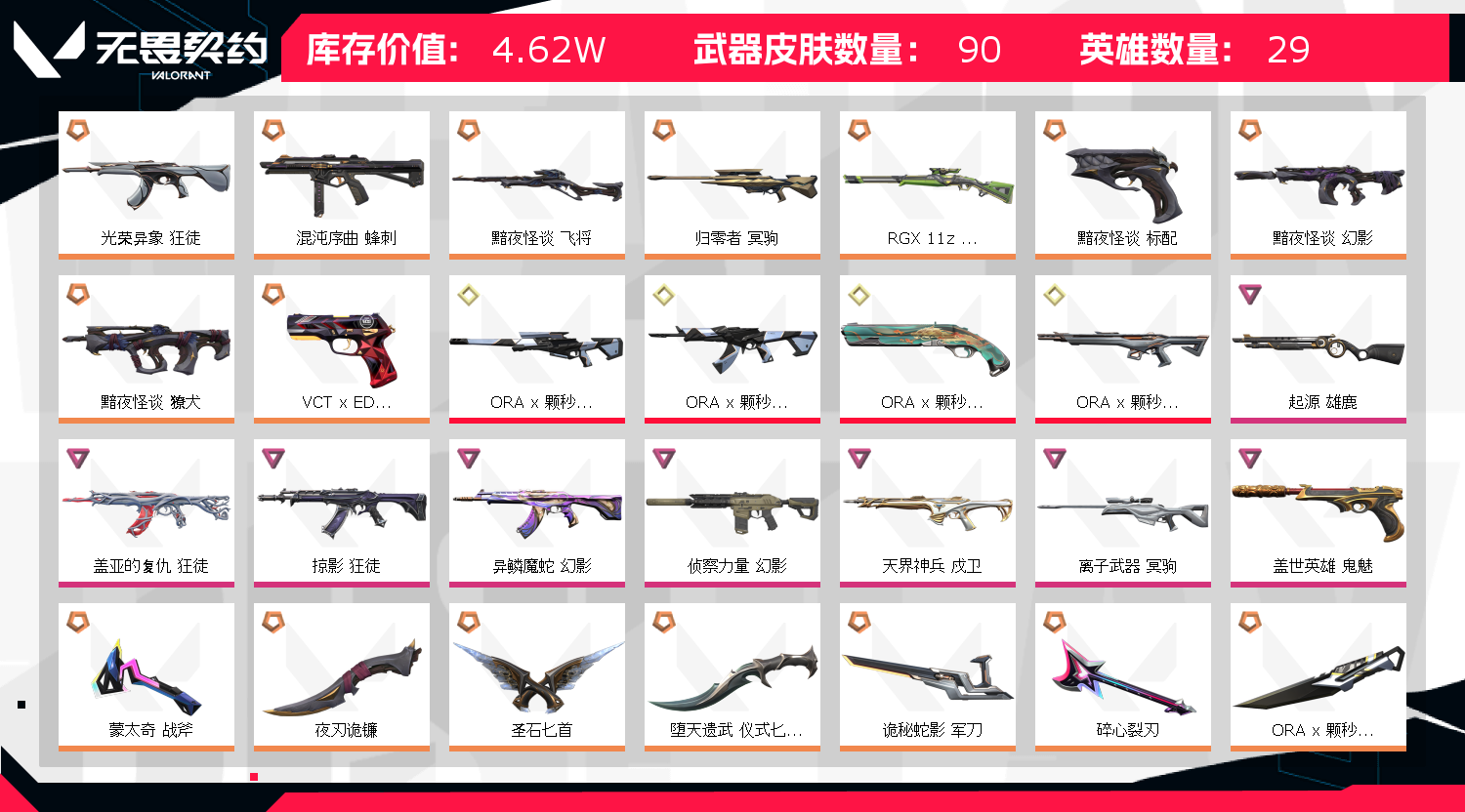 允许 英雄28 武器皮肤数量90;起源 雄鹿,盖亚的复仇 狂徒,掠影 狂徒,异鳞魔蛇 幻影,侦察力量 幻影,天界神兵 戍卫,光荣异象 狂徒,