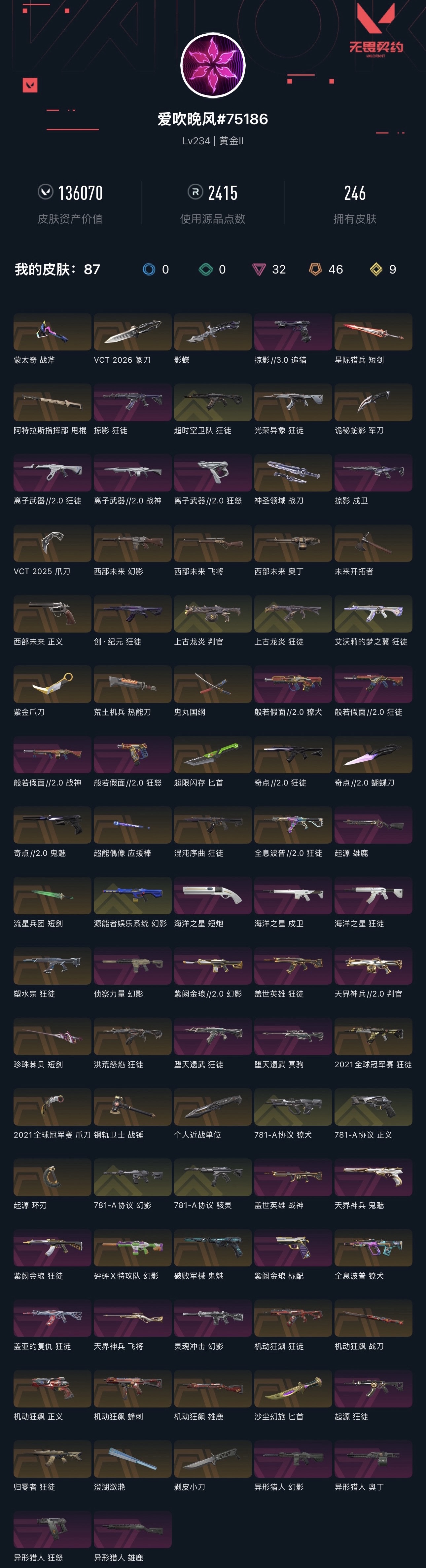 246款皮肤全收录,13W+资产价值 🈲挂 已备案 开挂必追究 ✅ 品质拉满:32款卓越级皮肤、9款终极皮肤,限定刀皮VCT 2026篆刀/VCT 2025爪刀/2021冠军刀全有,蒙太奇、离子武器//2.0、星际猎兵等热门套装齐全 ✅ 隐私安全:游戏内已隐藏ID、关闭语音/文字聊天,杜绝租客违规发言 ✅ 出租规则开挂/加好友,仅可匹配娱乐,违规将被平台追责 ✅ 省心体验:平台自动上号,全程无需打扰号主,订单结束自动重置密码,安全无忧 💡 适合想体验高质量皮肤的玩家,账号无任何封禁记录,放心租用!;西部未来 奥丁,紫金爪刀,剥皮小刀,VCT 2025 爪刀,起源 雄鹿,上古龙炎 判官,盖亚的复仇 狂徒,