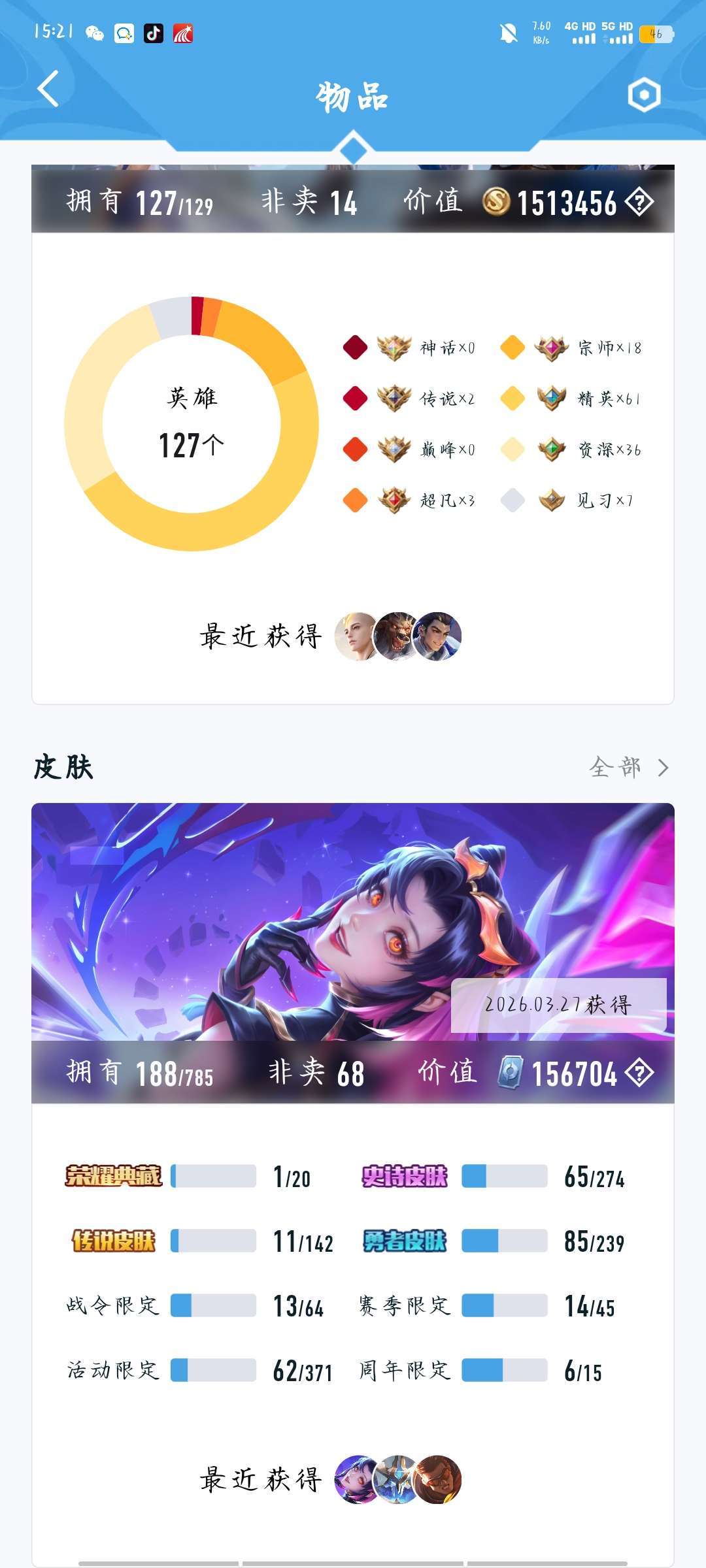 贵7,凯典藏,马超琥珀,火舞绯月行镜干将MVP,孙尚香曜澜年限,宫本传说,阿离兔子……英雄127