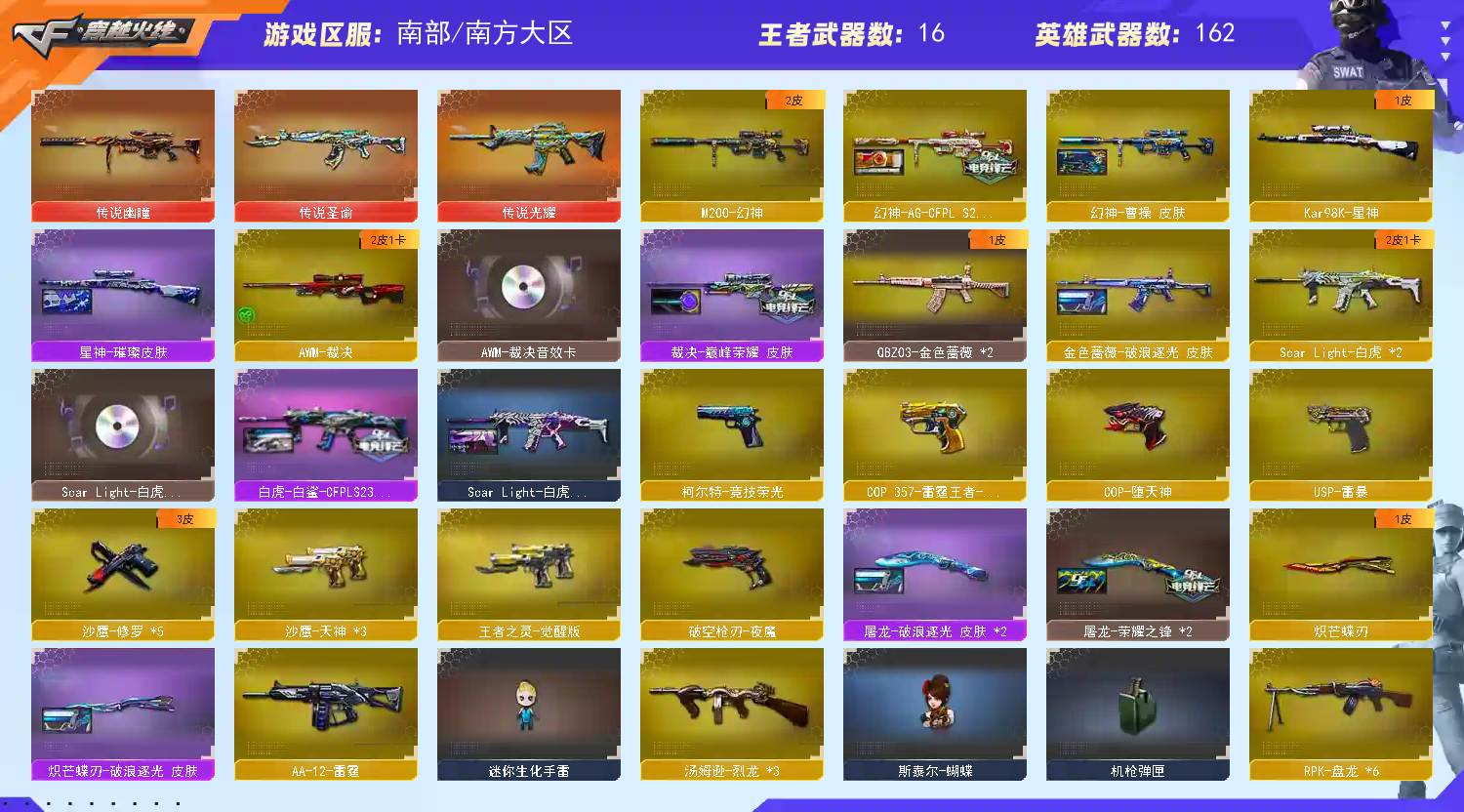 【南.部】双全天花板♥幽瞳幻神三件套奇幻泡泡象赋予六盘蝴蝶刀♥星神带卡裁决三件套♥白虎三件套满副武器;USP-雷暴,炽芒蝶刃,电竞教官-云悠悠,RPK-盘龙,QBZ03-金色蔷薇,传说幽瞳,M200-幻神,