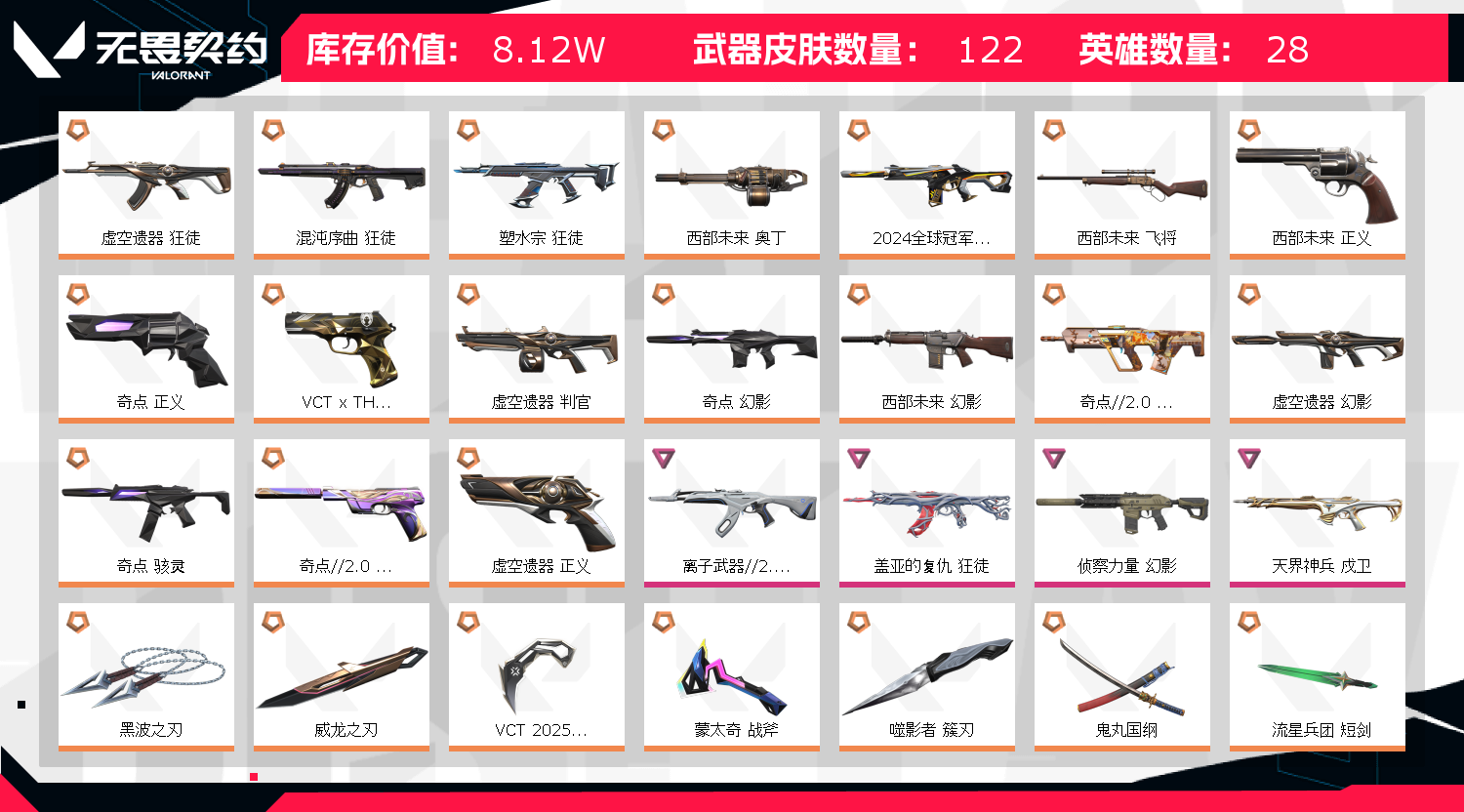 【卡面信息】VCT2025CN联赛卡面,西部未来卡面,先驱者卡面,分崩离析卡面,双城之战拥抱卡面,;西部未来 奥丁,黑波之刃,威龙之刃,VCT 2025 爪刀,盖亚的复仇 狂徒,虚空遗器 狂徒,侦察力量 幻影,
