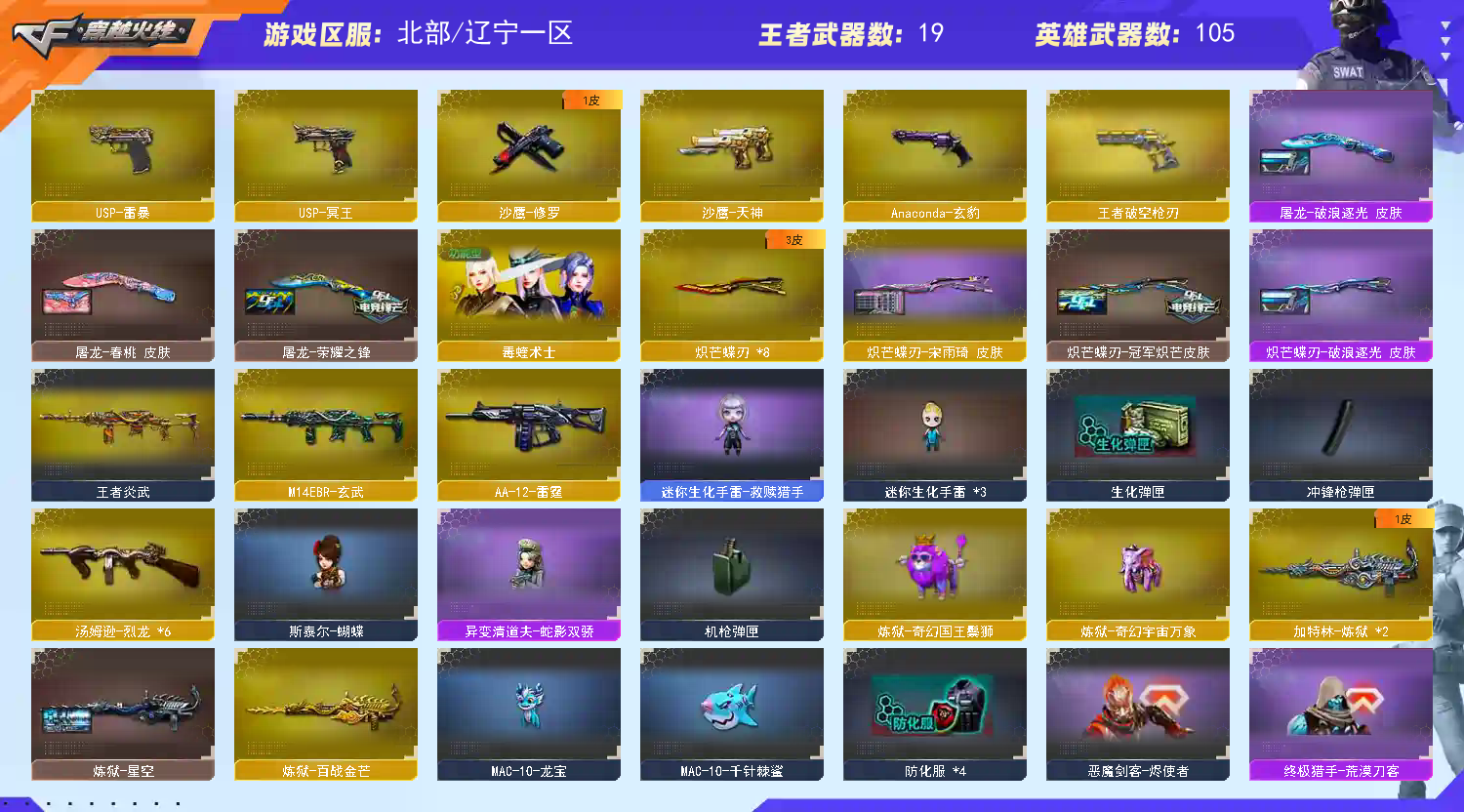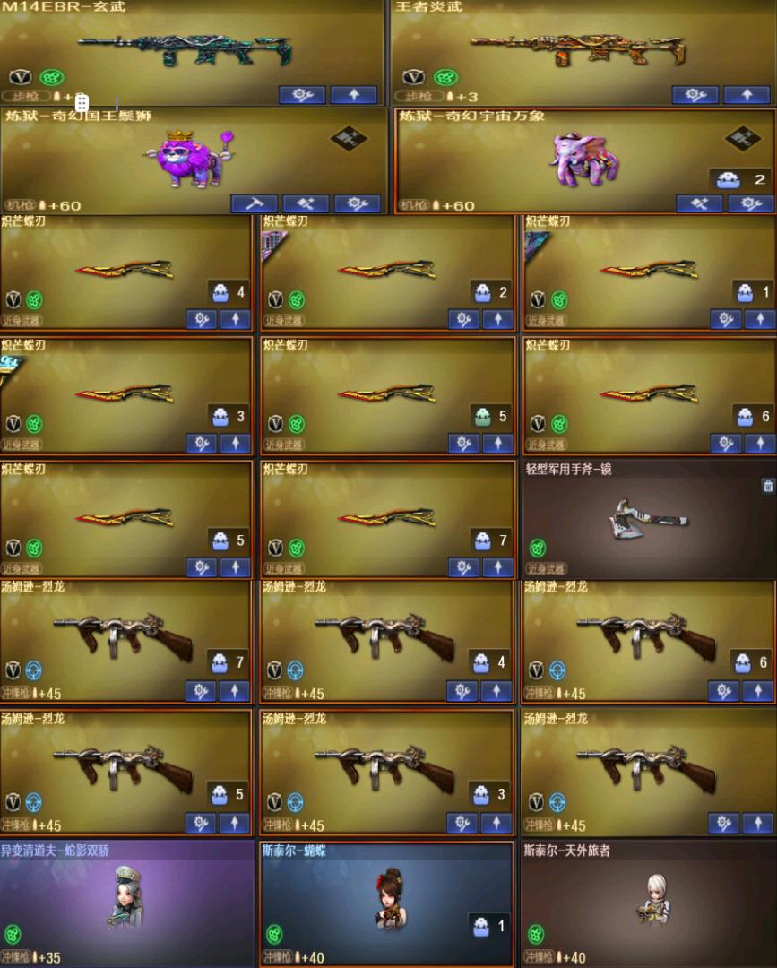 账号已备案,双全装,神威莲华,炼狱狮子,泡泡象,蝴蝶刀✖️8,玄武✖️2,斯太尔蝴蝶,幻影,幻神。