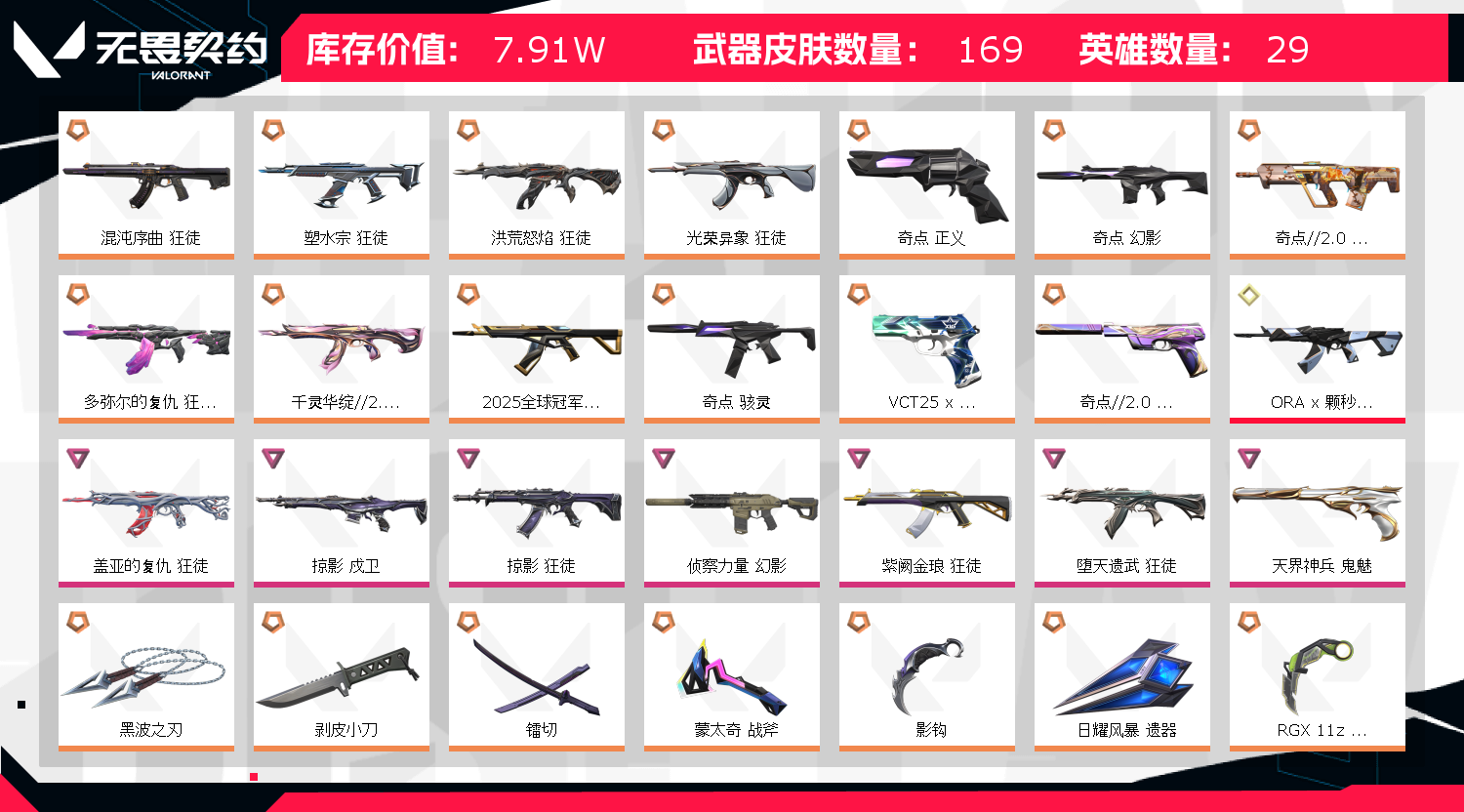 首页 > 租号大厅 > 无畏契约-wegame > wegame/wegame > 挂机拉黑⭐VCT篆刀怜悯黑波剥皮显卡爪镭切⭐掠夺套⭐奇点套⭐威龙天界鬼魅⭐猴子盖亚流脓紫金弃王狂徒等
