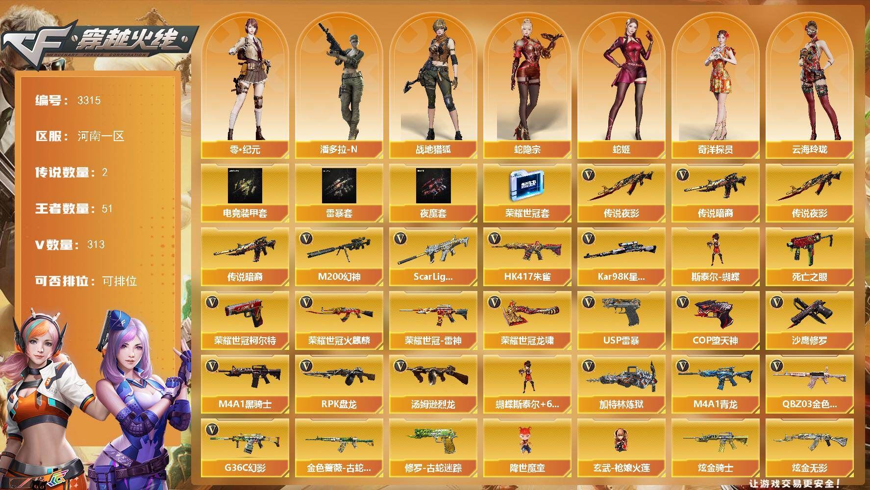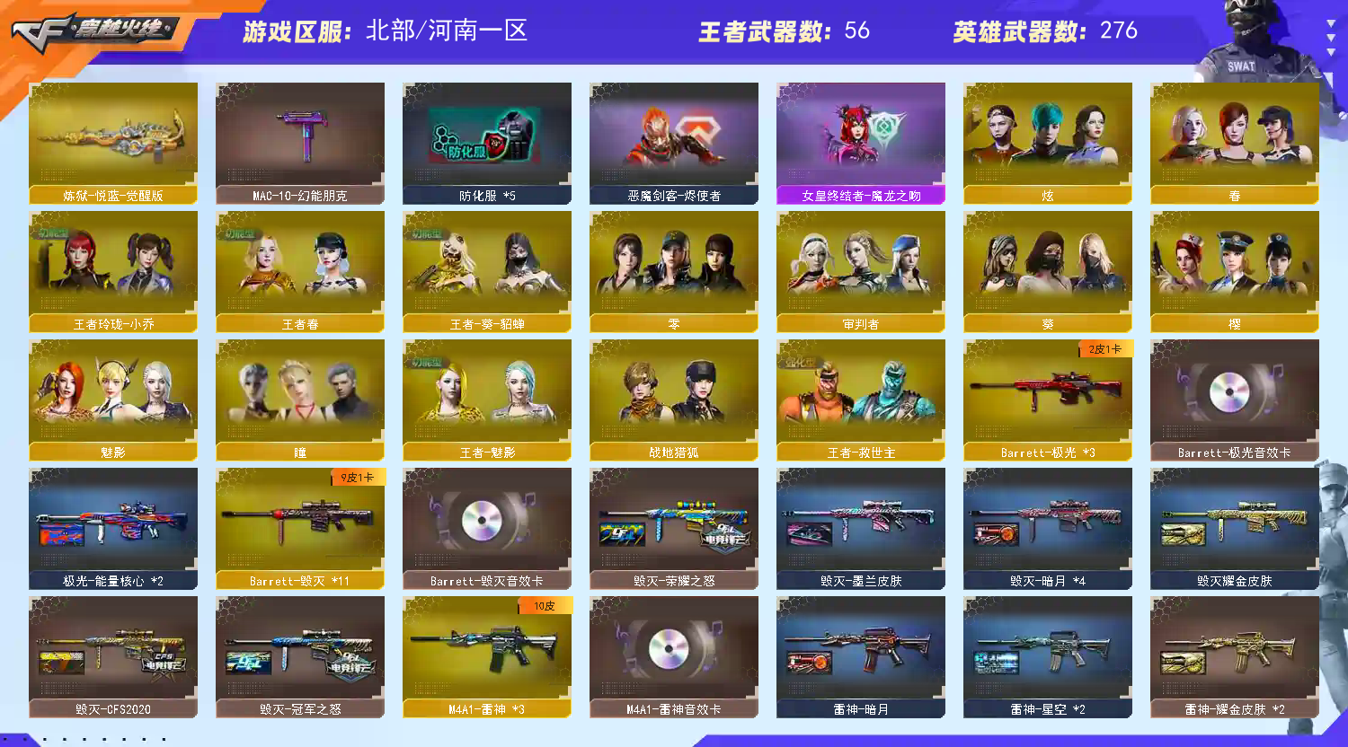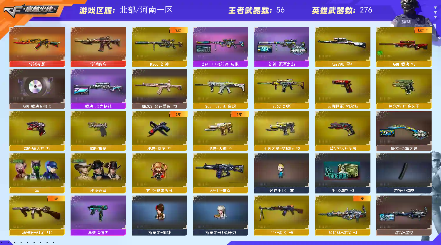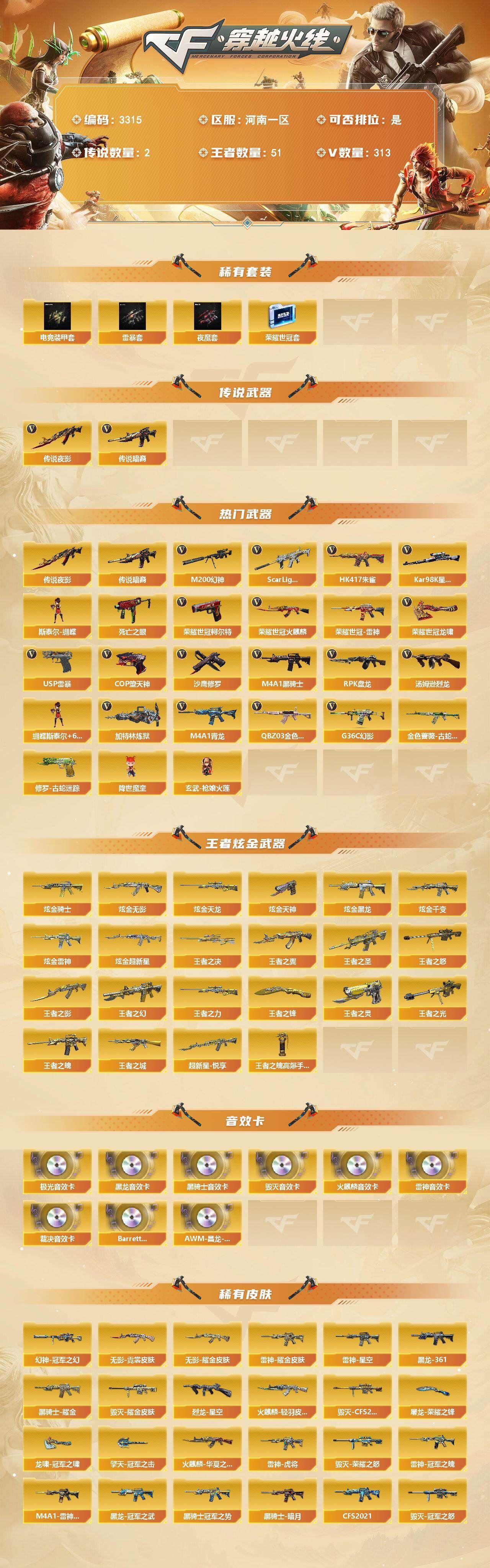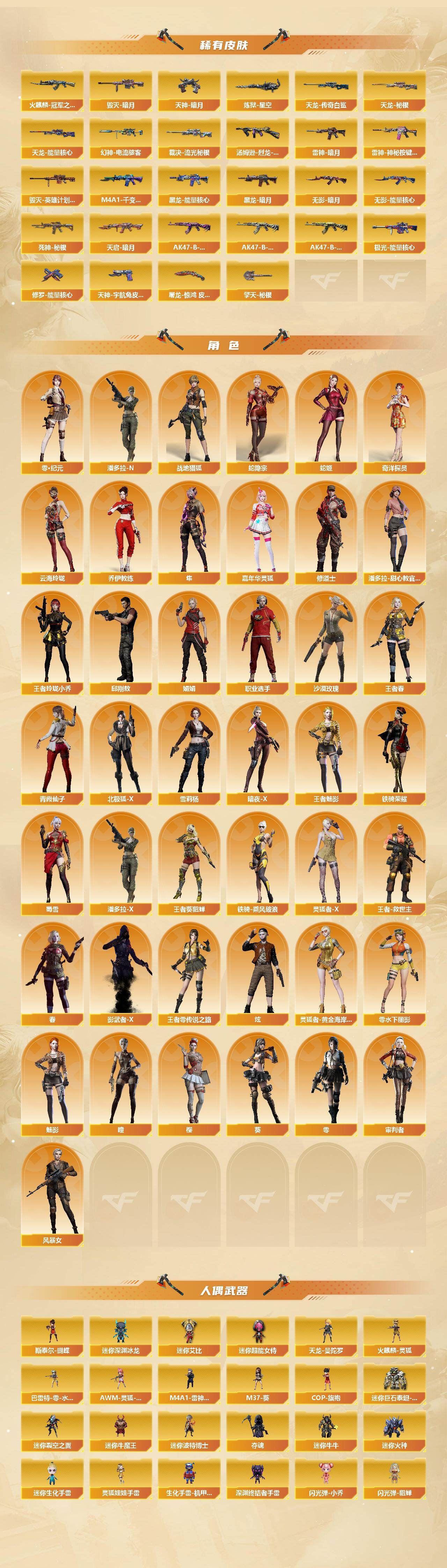 【传说武器】:传说暗裔,传说夜影【热门武器】:传说暗裔,传说夜影,G36C-幻影,QBZ03-金色蔷薇*3,Scar Light-白虎,HK417-朱雀,M4A1-青龙,M200-幻神,金色蔷薇-古蛇迷踪,修罗-古蛇迷踪,死亡之眼,荣耀世冠-火麒麟,荣耀世冠-雷神,荣耀世冠-柯尔特,Kar98K-星神,M4A1-黑骑士*5,汤姆逊-烈龙*12,RPK-盘龙*5,加特林-炼狱*4,斯泰尔-蝴蝶,降世魔童,玄武-枪娘火莲,USP-雷暴,COP-堕天神*3,沙鹰-修罗*4,荣耀世冠-龙啸*2【稀有套装】:夜魔套,雷暴套,电竞装甲套,荣耀世冠套【王者炫金武器】:王者之圣,王者之城,超新星-悦享,王者之幻,王者之翼,王者之影,王者之魄*3,王者之决,王者之光,王者之怒*4,王者之力*3,王者之灵*4,王者之锋*4,王者之魄高爆手雷*2,炫金骑士,炫金无影,炫金黑龙*2,炫金千变*3,炫金雷神*3,炫金超新星*2,炫金天龙*6,炫金天神*4【音效卡】:AK47-火麒麟音效卡*2,M4A1-雷神音效卡,M4A1-黑龙音效卡,M4A1-黑骑士音效卡,Barrett-毁灭音效卡,Barrett-极光音效卡,AWM-裁决音效卡,Barrett-碧霄极光音效卡,AWM-昌龙-怀旧音效卡【皮肤】:幻神-冠军之幻,幻神-电流骇客 皮肤,裁决-流光秘银,烈龙-星空,汤姆逊-烈龙-末日皮肤,雷神-暗月,雷神-星空*2,M4A1-雷神-CFS 2019,雷神-虎将*2,雷神-耀金皮肤*2,雷神-冠军之魄,雷神-神秘按键 皮肤,火麒麟-冠军之心,火麒麟-华夏之心,火麒麟-轻羽皮肤,毁灭-荣耀之怒,毁灭-冠军之怒,毁灭-CFS2020,黑龙-冠军之武,黑骑士-冠军之势,黑骑士-CFS2021,无影-暗月*3,无影-能量核心,无影耀金皮肤*2,无影-霓裳皮肤,死神-秘银*2,屠龙-荣耀之锋,屠龙-惊鸿 皮肤,龙啸-冠军之啸,擎天-秘银,擎天-冠军之击【角色】:零,葵,樱,瞳,魅影,炫,春,四防沙漠玫瑰,隼,审判者,零·纪元,战地猎狐,四防王者-葵-貂蝉,四防王者春,四防王者-魅影,王者-救世主,四防王者玲珑-小乔,蛇隐宗,奇洋探员,乔伊教练,修道士,云海玲珑,零-水下丽影,灵狐者-X,灵狐者-黄金海岸,潘多拉-X,潘多拉-甜心教官,职业选手,【人偶武器】:玄武-枪娘火莲,天龙-曼陀罗,火麒麟-灵狐*3,M4A1-雷神-精英刀锋,斯泰尔-蝴蝶,巴雷特-零-水下丽影,Scar Light-马枪,斯泰尔-枪娘暗刃,AWM-灵狐-15周年嘉年华*2,M37-葵,COP-旗袍,迷你深渊冰龙*2,迷你裂空之翼,迷你牛魔王,迷你波特博士,夺魂,迷你牛牛,迷你火种,迷你生化手雷,生化手雷-机甲核心*2,深渊终结者手雷,闪光弹-小乔,闪光弹-貂蝉,高爆手雷-大乔,迷你艾比,迷你超能女侍,迷你巨石泰坦-魔花研究所,灵狐娃娃手雷,降世魔童【暴走生化】:异变清道夫,死亡之眼,超级对讲机【挑战大师】:暴君乱世-超越Max,神圣爆裂者III,冰龙粉碎者-白马银枪,VEPR-12-金魔,激光毁灭者III*2,机甲撕裂者III,试炼破坏者III,KAC-圣炎切割者III,神圣爆裂者-末日III,封神放逐者III【英雄级武器】:M4A1-青龙,HK417-朱雀,Scar Light-白虎,M4A1-夜魔,G36C-幻影,金色蔷薇-古蛇迷踪,M4A1-玫瑰精灵,QBZ03-金色蔷薇*3,M4A1-猎神*4,9A91-烈火*5,王者之心-觉醒版,王者之武-觉醒版,王者之势-觉醒版,王者之戮-觉醒版,王者之幻-觉醒版,荣耀世冠-火麒麟,荣耀世冠-雷神,机械迷城-穹宇,AK47-B-身先士卒,AK47-B-战士*2,AWM-天龙*3,Barrett-毁灭*11,Barrett-极光*3,AWM-裁决*3,M200-幻神,Barrett-朱雀,Kar98K-星神,Barrett-电竞装甲,Barrett-金色蔷薇*2,王者幻神-觉醒版,王者蔷薇-觉醒版,RPK-盘龙*5,加特林-炼狱*4,炼狱-悦蓝-觉醒版,汤姆逊-烈龙*12,烈龙-悦心-觉醒版*3,【道具】:超级背包,黄金巨石泰坦-魔花研究所背包,女皇终结者-魔龙之吻,救世主-黑桃战神,妩媚妖姬,黄金生化钩*2,绿色巨人,灵魂忍者*2,变异宝贝,妖姬,迷雾幽灵,生化弹匣*3,夺命之镰*3,防化服*5,新白银C4,C4-再燃火线,防弹头盔*4,防弹衣*5,C4工具钳*3,手雷包*3【特殊枪械】:蝴蝶斯泰尔+6烈龙,1白虎,5黑骑士,6烈龙,5盘龙,4炼狱,1蝴蝶斯泰尔;USP-雷暴,荣耀世冠-柯尔特,沙漠玫瑰,隼,RPK-盘龙,QBZ03-金色蔷薇,G36C-幻影,