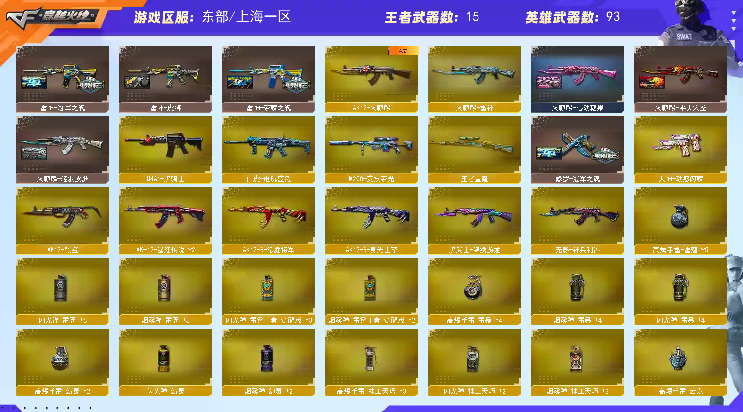 【传说武器!!!】【M200幻神+宠儿皮肤+巅峰荣耀皮肤+传说破晓+炽芒蝶刃】【王者星霆】【M200竞技荣光】【白虎+霓虹机甲皮肤+大汉风骨皮肤】【qbz03金色蔷薇】【雷神+荣耀之魄皮肤+冠军之魄皮肤】【火麒麟 黑骑士 黑鲨 无忧神兵利器 黑武士锦绣游龙 超新星热带奇洋 金色蔷薇古蛇迷踪 烈火动感闪耀 猩红传说 常胜将军 白虎电玩蓝兔 毁灭 裁决 烈龙】——【沙鹰修罗 沙鹰天神 cop357雷霆 usp雷暴 usp神工天巧 天神动感闪耀 修罗古蛇迷踪 荣耀世冠柯尔特 cop357雷霆王者】——【屠龙 尼泊尔雷霆 斩神刀雷暴 幻灵之锋 擎天竞技荣光 炽芒蝶刃 屠龙动感闪耀 擎天云海游龙 云龙扇 龙啸热带奇洋 王者之锋 雷霆王者之锋 龙啸烈火龙威】——【雷霆投掷武器套装*5 雷暴投掷武器套装*4 幻灵投掷武器套装*2 竞技荣光投掷武器套装 神工天巧投掷武器套装*3 云龙投掷武器套装 雷霆王者投掷武器套装】——【热门武器/小人枪】【朱雀蛇隐宗 斯泰尔蝴蝶】——【角色】【4防(王者葵惊若翩鸿 王者炫)】【炫】;USP-雷暴,荣耀世冠-柯尔特,炽芒蝶刃,QBZ03-金色蔷薇,M200-幻神,Scar Light-白虎,