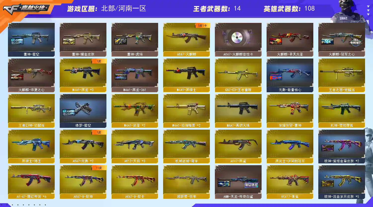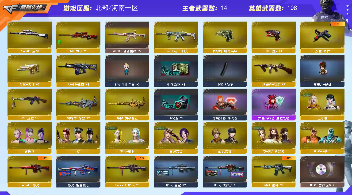 【Kar98K-星神】【王者幻神】【ScarLight-白虎】【QBZ03-金色蔷薇】【生化 4盘龙 3炼狱 6烈龙 蝴蝶 死亡之眼】【裁决】【Barrett-毁灭】【极光】【AK47-火麒麟+音效卡+火麒麟-冠军之心】【黑龙】【M4A1-雷神+音效卡】【黑骑士】【王者之心 王者之武 王者之势 王者之力】【无影 死神 天启 黑鲨 hk417-朱雀 玫瑰精灵 烈火 黑武】【6手枪 修罗 天神*2 cop堕天神】【9近战 屠龙 麒麟刺 王者之刺】【手雷 雷霆雷 堕天神 夜魔雷 电竞装甲】【四防 王者春 王者魅影 】;RPK-盘龙,QBZ03-金色蔷薇,Scar Light-白虎,Kar98K-星神,