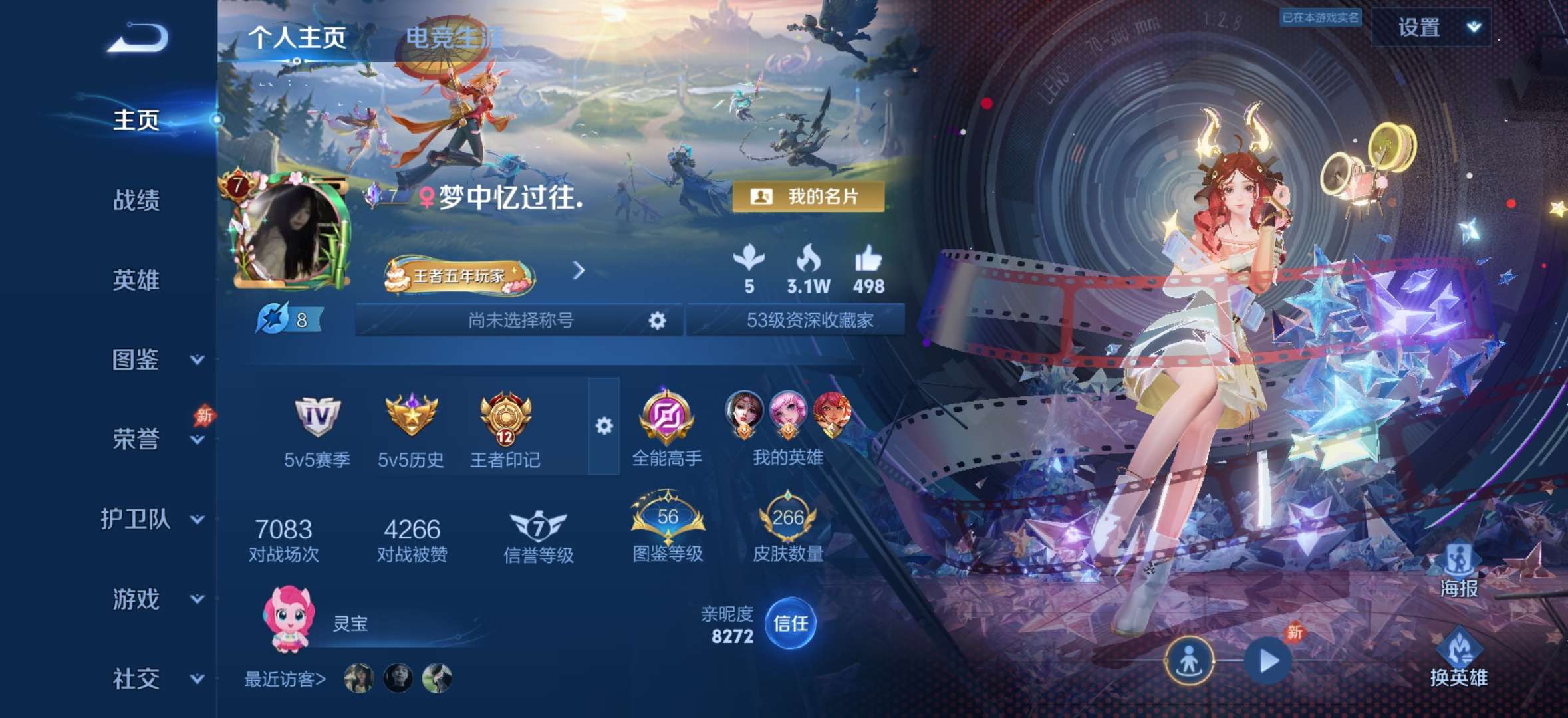 贵族等级V7,段位永恒钻石,英雄数量128,典藏皮肤数1,皮肤数量265,愿照·众生和/时之祈愿瑶/默契交锋(花木兰)/神骥·鸣幻洲/至美·乘鲤谣/曦玄引(貂蝉)/拾光映像/乘龙·聚宝船/续相思/神骥·聚万邦/神树通天/愿照·众生和/时之祈愿瑶/默契交锋(花木兰)/神骥·鸣幻洲/至美·乘鲤谣/曦玄引(貂蝉)/拾光映像/乘龙·聚宝船/续相思/神骥·聚万邦/神树通天