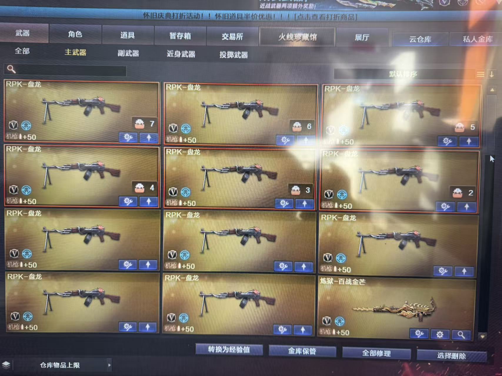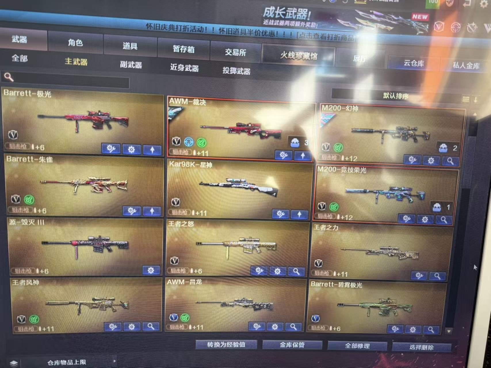爆破号/生化号/挑战号/幻神2皮肤加音效卡/星神带音效卡/裁决带音效卡/王者风神/竞技荣光全套/雷暴/柯尔特/冥王等手枪/天袭/玄豹/王者武器全套/G36C、白虎、M4、黑骑士、H417、主武器带音效卡/皮肤/特殊角色/4防角色/挑战黄金套装/生化角色/6列6盘龙/炽芒蝶刃/全弹匣;USP-雷暴,炽芒蝶刃,电竞教官-云悠悠,晴雅,RPK-盘龙,QBZ03-金色蔷薇,G36C-幻影,