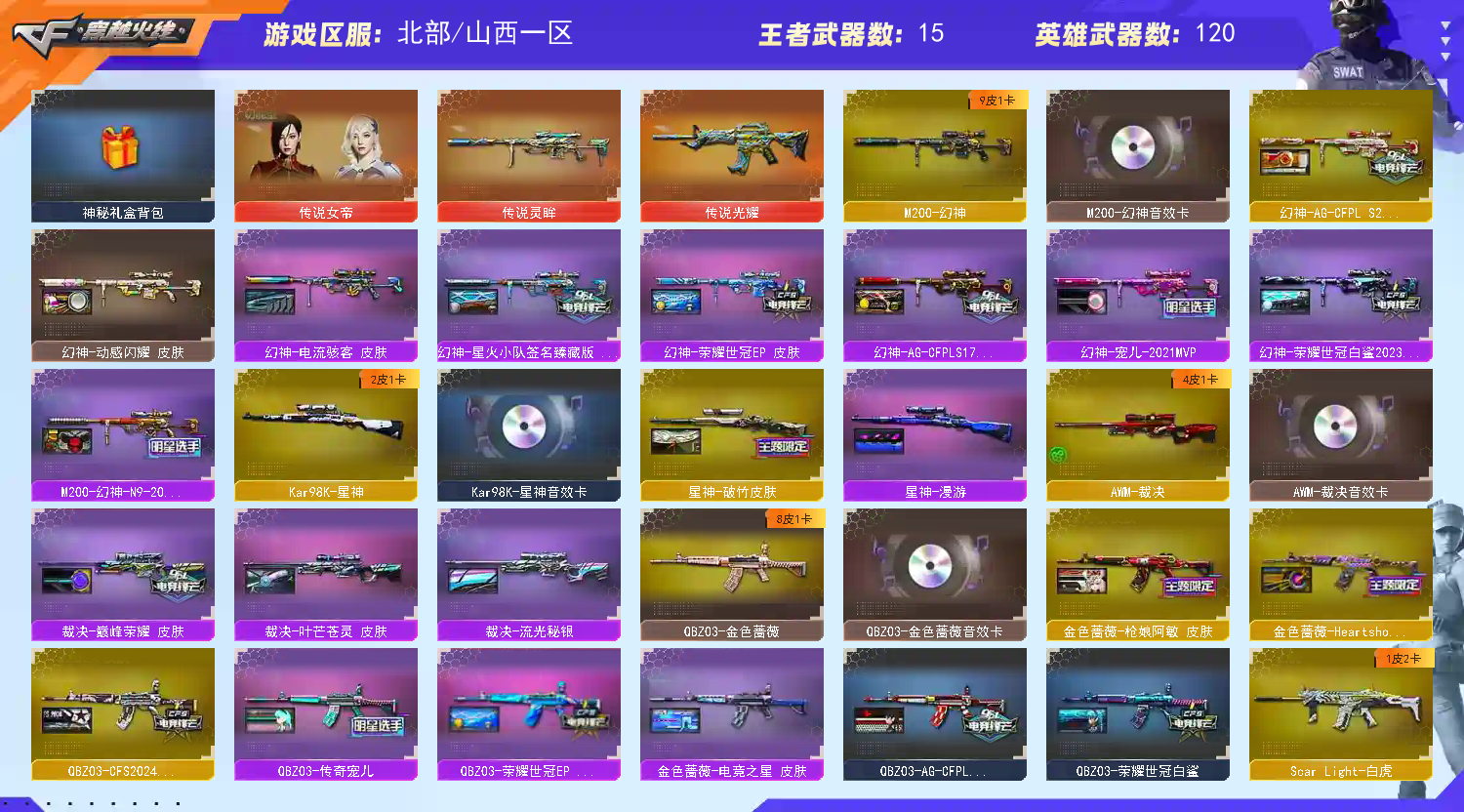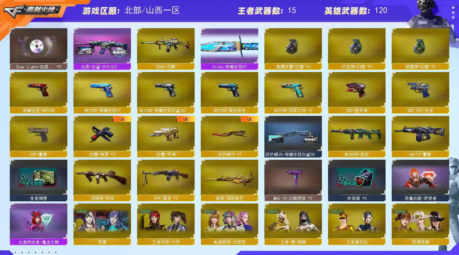 【V武器数126】【幻神三件套】【幻神7皮】【星神三件套】【裁决三件套】【白虎三件套】【金色蔷薇三件套】【夜魔套装X2套】【幻兽套装X3套】【传说女帝】【传说灵眸】【传说光耀】【神秘礼盒背包】【QBZ95-幻兽】【沙鹰-幻兽】【高爆手雷-幻兽】【闪光弹-幻兽】【烟雾弹-幻兽】【M200-幻神】【幻神-荣耀世冠EP 皮肤】【幻神-AG-CFPL S24冠军 皮肤】【幻神-荣耀世冠白鲨2023 皮肤】【幻神-星火小队签名臻藏版 皮肤】【幻神-宠儿-2021MVP】【M200-幻神-N9-2022MVP】【幻神-AG-CFPLS17冠军】【幻神-电流骇客 皮肤】【幻神-动感闪耀 皮肤】【M200-幻神音效卡】【M200-竞技荣光】【王者幻神-觉醒版】【Kar98K-星神】【星神-漫游】【星神-破竹皮肤】【Kar98K-星神音效卡】【王者星神-觉醒版】【AWM-裁决】【AWM-裁决音效卡】【裁决-巅峰荣耀 皮肤】【裁决-流光秘银】【裁决-叶芒苍灵 皮肤】【Scar Light-白虎】【白虎-白鲨-CFPLS23冠军】【Scar Light-白虎音效卡】【白虎-电玩蓝兔】【王者白虎-觉醒版】【QBZ03-金色蔷薇】【QBZ03-传奇宠儿】【金色蔷薇-Heartshot皮肤】【QBZ03-荣耀世冠白鲨】【QBZ03-AG-CFPLS19冠军】【QBZ03-CFS2024 皮肤】【金色蔷薇-枪娘阿敏 皮肤】【QBZ03-金色蔷薇音效卡】【QBZ03-天罚】【QBZ-03-王者蔷薇-觉醒版】【王者芳薇-觉醒版】【G36C-幻影】【M4A1-青龙】【HK417-朱雀】【M14EBR-玄武】【M4A1-夜魔】【柯尔特-荣耀世冠白鲨2023】【USP-雷暴】【柯尔特-冠军之特】【荣耀世冠-柯尔特】【柯尔特-竞技荣光】【沙鹰-幻兽】【COP-堕天神】【COP 357-云龙】【炽芒蝶刃】【炽芒蝶刃-荣耀世冠白鲨2023 皮肤】【RPK-盘龙】【炼狱-百战金芒】【汤姆逊-烈龙】【传说女帝】【电竞教官-云悠悠】【华】【荒漠琉璃】【葵】【乔伊教练】【审判者】【王者-葵-貂蝉】【王者葵-惊若翩鸿】【王者玲珑-小乔】【王者潘多拉】【王者之瞳】【雨棠】【M4A1-雷神】【雷神-荣耀之魄】【雷神-宠儿-2019MVP】【雷神-冠军之魄】【雷神-传奇N9】【雷神-动感闪耀 皮肤】【AK47-火麒麟】【AK47-火麒麟-传奇EVEN】【火麒麟-冠军之心】【火麒麟-巅峰荣耀】【火麒麟-荣耀世冠AG】【传奇石头-横秒之巅】【火麒麟-轻羽皮肤】【火麒麟-盘古】【火麒麟-心动糖果】【火麒麟-CFSTAR】【M4A1-黑骑士】【黑骑士-地狱火】【黑骑士-冠军之势】【黑骑士-伏羲】【黑骑士-CFS2021】【黑骑士-暗月】【M4A1-黑骑士音效卡】【M4A1-黑龙】【黑龙-暗月】【Barrett-毁灭】【毁灭-SV-CFPLS16冠军】【毁灭-暗月】【毁灭-黑大圣皮肤】【Barrett-毁灭音效卡】;USP-雷暴,荣耀世冠-柯尔特,柯尔特-荣耀世冠白鲨2023,柯尔特-冠军之特,炽芒蝶刃,传说女帝,电竞教官-云悠悠,