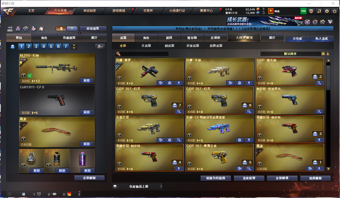 王者武器:王者白虎-觉醒版;炫金毁灭;COP 357-雷霆王者-觉醒版;闪光弹-雷霆王者-觉醒版;烟雾弹-雷霆王者-觉醒版;高爆手雷-雷霆王者;王者之烈-觉醒版;王者之击-觉醒版;王者之锋-觉醒版;王者幻神-觉醒版;炫金无影;QBZ-03-王者蔷薇-觉醒版;炫金雷神;炫金千变;王者之灵-觉醒版;王者之心-觉醒版;王者之幻;王者之魄高爆手雷;王者之魂;王者之魄闪光弹;王者之魄烟雾弹;王者之锋;王者之翼;王者之力 英雄武器:龙啸-烈火龙威;无影-神兵利器;闪光弹-竞技荣光;高爆手雷-竞技荣光;烟雾弹-竞技荣光;柯尔特-竞技荣光;擎天-竞技荣光;AK47-无影;传说梦魇;马来剑-夜魔;烟雾弹-夜魔;高爆手雷-夜魔;闪光弹-夜魔;荣耀世冠-柯尔特;Kar98K-星神;RPK-盘龙;传说圣灵;AK-47-猩红传说;Barrett-毁灭;AK47-B-常胜将军;AK47-B-战士;AK47-B-身先士卒;AWM-裁决;M4A1-千变;AN94-超新星;天神-CF网剧冠军;黑武士-CF网剧冠军;擎天-CF网剧冠军;COP 357-幻灵;M4A1-幻灵;幻灵之锋;高爆手雷-幻灵;烟雾弹-幻灵;闪光弹-