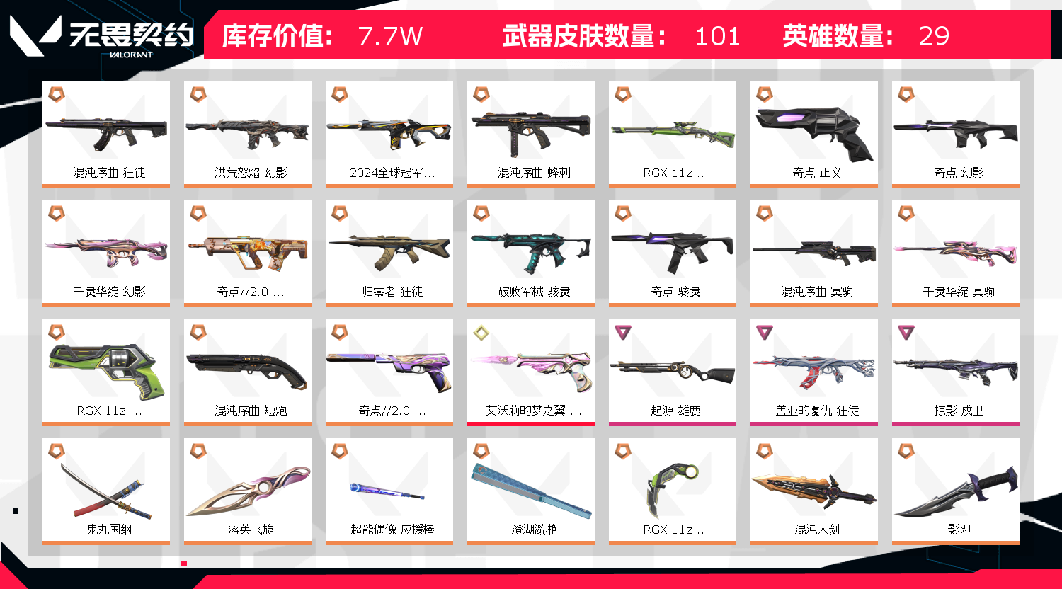 允许 英雄28 武器皮肤数量101;起源 雄鹿,盖亚的复仇 狂徒,掠影 戍卫,掠影 狂徒,侦察力量 幻影,洪荒怒焰 幻影,紫阙金琅 狂徒,