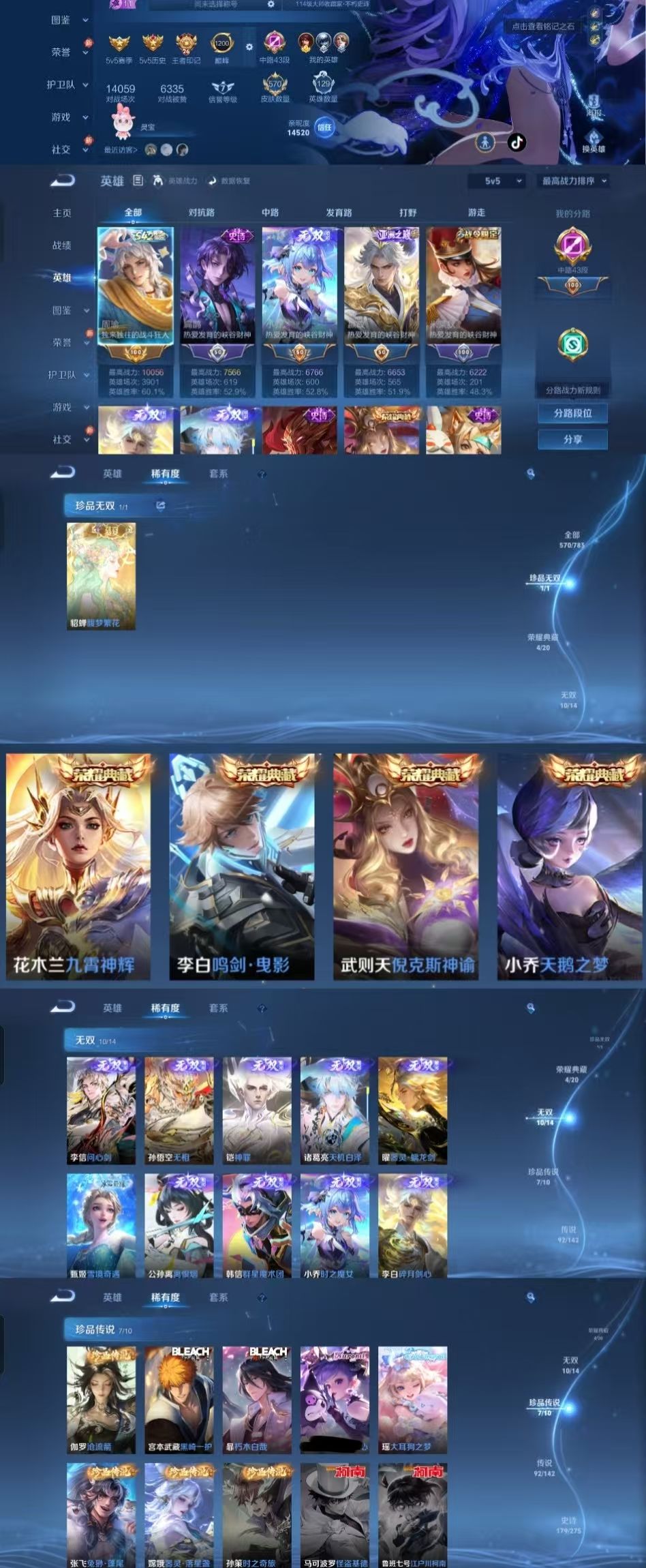 【非云直上】V10★皮肤榜一★539皮满典藏★鲁班时之奇旅会员★虞姬黛羽霜翎星元★吕布白金战神★全能大师★多金标★个性按键
