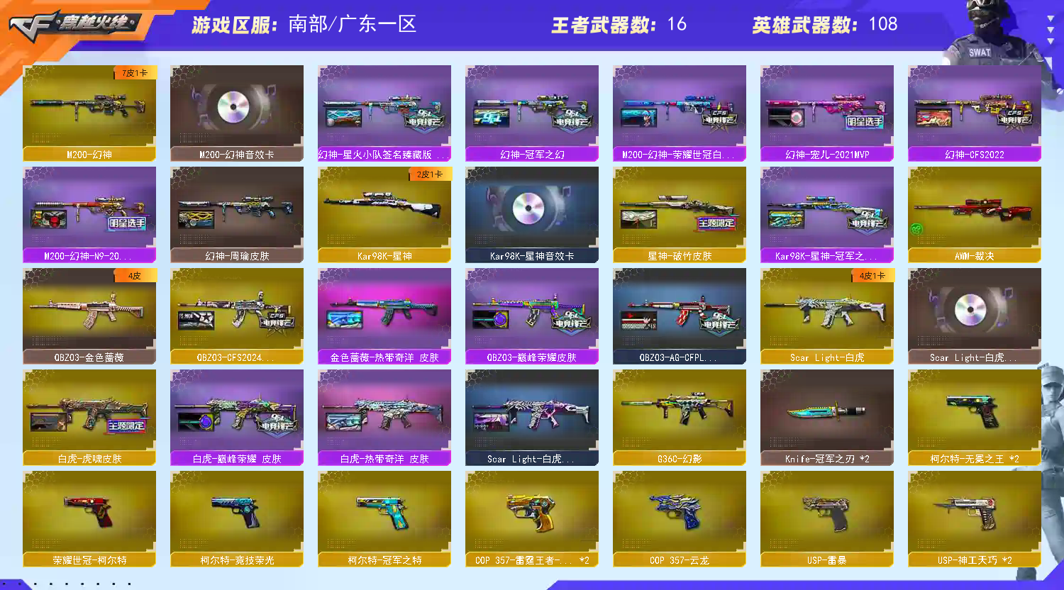 【幻神7皮3件套!!!】【星神3件套!!!】【白虎3件套!!!】【m200幻神+幻神音效卡+宠儿皮肤+星火小队皮肤+冠军之幻皮肤+荣耀世冠白鲨皮肤+n9皮肤+周瑜皮肤+cfs2022皮肤+柯尔特冠军之特+usp雷暴+柯尔特无冕之王*2+炽芒蝶刃+冠军之刃*2】【m200竞技荣光套装+电竞教官云悠悠】【98k星神+星神音效卡+冠军之星皮肤+破竹皮肤】【白虎+白虎音效卡+巅峰荣耀皮肤+虎啸皮肤+暗星皮肤】【qbz03金色蔷薇+ag冠军皮肤+巅峰荣耀皮肤+cfs2024皮肤+qbz03云龙】【g36c幻影】【神工天巧套装】【荣耀世冠套装】【毁灭+毁灭音效卡+荣耀之怒皮肤】【雷神+荣耀之魄皮肤+巅峰荣耀皮肤】【火麒麟+冠军之心皮肤+横秒之巅皮肤】【黑骑士+冠军之势皮肤】【王者凤吟 王者之心】【天启 身先士卒 战神 黑鲨 黑龙 机械迷城 黑骑士海王 无影神兵利器 黑武士 超新星 白虎电玩 超新星热带奇洋 黑武士锦绣游龙 天龙 暗月传说 极光 裁决 aa12雷霆 】——【热门武器/小人呛】【马呛 】——【柯尔特冠军之特 usp雷暴 柯尔特无冕之王*2 cop雷霆王者*2 cop云龙 usp神工天巧*2 荣耀世冠柯尔特 柯尔特竞技荣光 修罗】——【炽芒蝶刃 幻灵之锋 龙啸烈火龙威 龙啸热带奇洋 龙啸云海游龙 麒麟刺 擎天 擎天竞技荣光 荣耀世冠龙啸 屠龙 王者之刺 王者之锋 王者之啸 唐刀神工天巧 擎天云海游龙 屠龙动感闪耀】——【幻灵投掷武器套装+竞技荣光投掷武器套装*3+神工天巧投掷武器套装+云龙投掷武器套装】——【角色】【4防(电竞教官云悠悠 晴雅 鹰 王者凌霄 王者涂鸦 兰梨园特工 )】【葵 零】;USP-雷暴,柯尔特-无冕之王,荣耀世冠-柯尔特,柯尔特-冠军之特,炽芒蝶刃,Knife-冠军之刃,电竞教官-云悠悠,