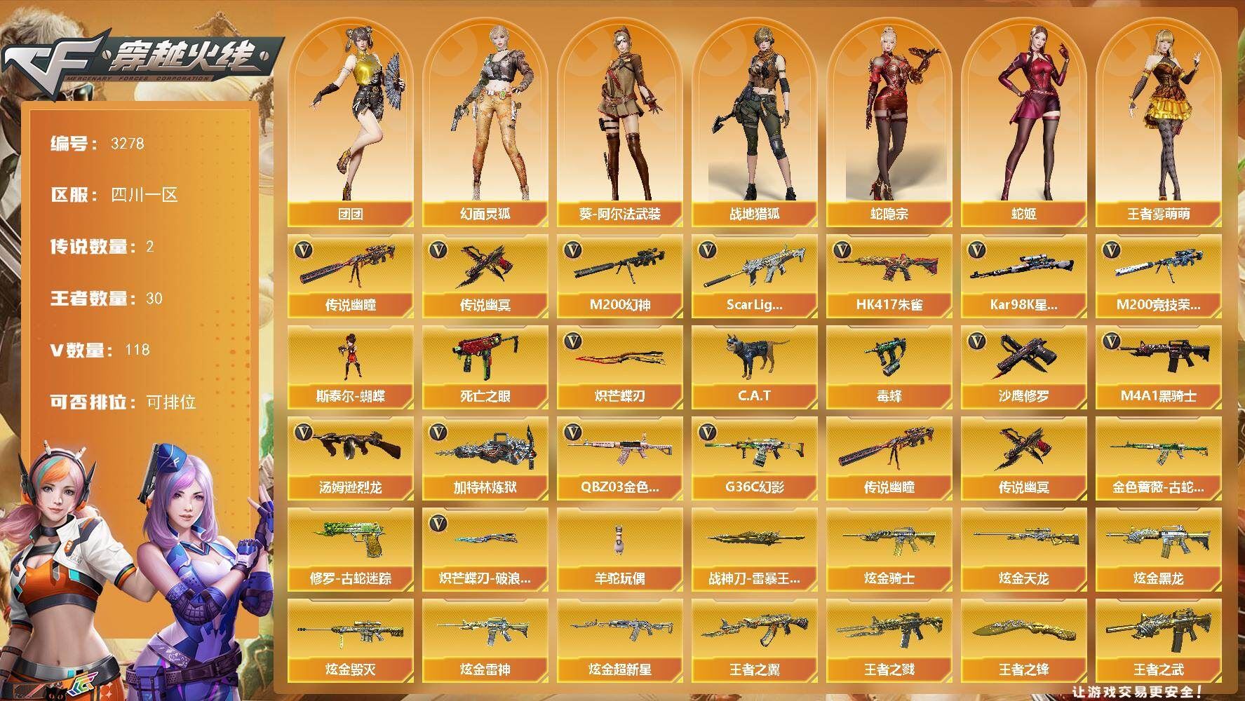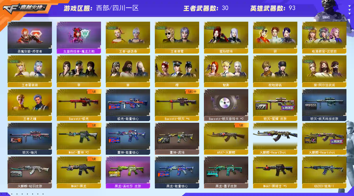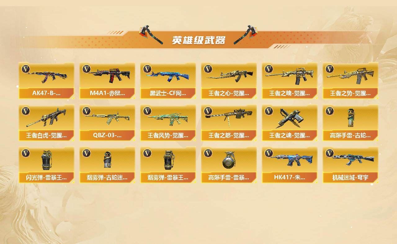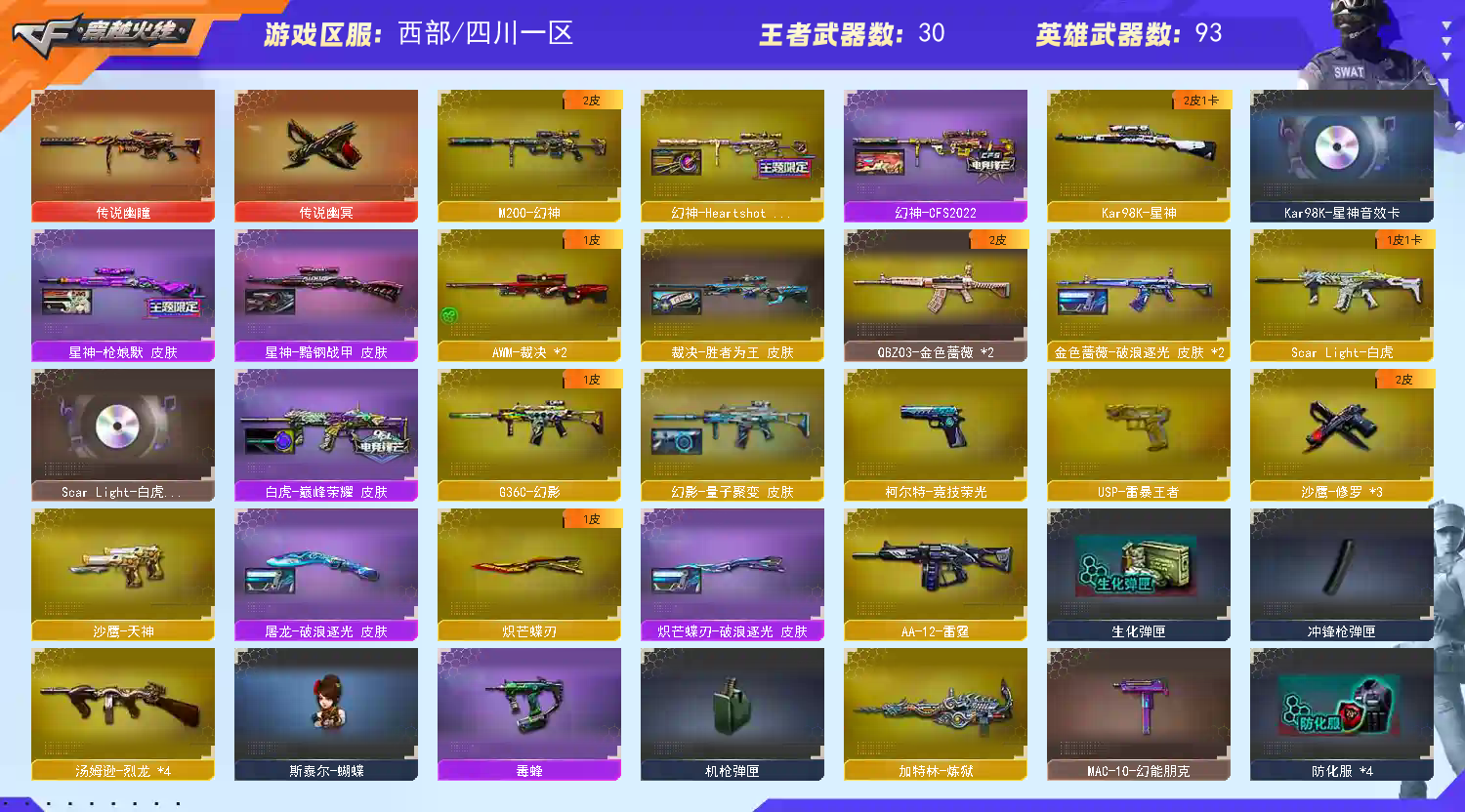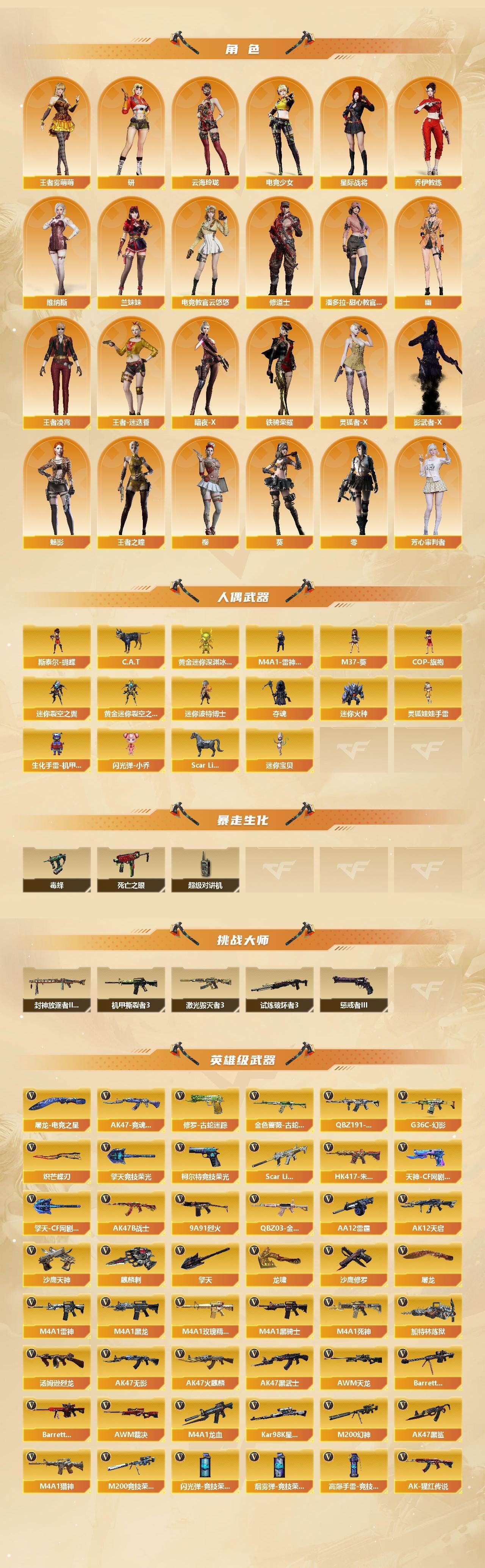【传说武器】:传说幽瞳,传说幽冥【热门武器】:传说幽瞳,传说幽冥,G36C-幻影,QBZ03-金色蔷薇*2,Scar Light-白虎,HK417-朱雀,M200-幻神,金色蔷薇-古蛇迷踪,修罗-古蛇迷踪,M200-竞技荣光,死亡之眼,Kar98K-星神,C.A.T,毒蜂,M4A1-黑骑士*5,汤姆逊-烈龙*4,加特林-炼狱,斯泰尔-蝴蝶,羊驼玩偶,沙鹰-修罗*3,炽芒蝶刃,炽芒蝶刃-破浪逐光 皮肤【王者炫金武器】:王者之戮,王者之翼,王者之武,王者火魄,王者霜心,王者雷影,王者之魂,USP-雷暴王者,COP-王者堕天神,王者之锋,斩神刀-雷暴王者,炫金骑士,炫金黑龙,炫金雷神,炫金超新星,炫金毁灭,炫金天龙*2【音效卡】:星神-古蛇迷踪音效卡,Barrett-毁灭音效卡*2,Scar Light-白虎音效卡,枪娘语音包-阿敏,枪娘语音包-凯萨林,Kar98K-星神音效卡【皮肤】:幻神-CFS2022,幻神-Heartshot 皮肤,白虎-巅峰荣耀 皮肤,金色蔷薇-破浪逐光 皮肤*2,裁决-胜者为王 皮肤,星神-枪娘默 皮肤,星神-黯钢战甲 皮肤,雷神-能量核心,雷神-虎将,雷神-CFS十周年纪念版 皮肤,火麒麟-轻羽皮肤,毁灭-暗月,毁灭-AG-CFPLS15冠军,毁灭-星耀 皮肤,毁灭-航天科技皮肤,毁灭-英雄计划 皮肤,黑龙-能量核心,黑龙-暗月,黑龙-美杜莎 皮肤,黑龙-墨子皮肤,无影-暗月,无影-能量核心,无影耀金皮肤,死神-秘银,天启-暗月*4,天启-黯钢战甲 皮肤,幻影-量子聚变 皮肤,战神-粉色甜心皮肤*2,战神-紫绶金章皮肤*3,战神-流金岁月皮肤,天龙-秘银*2,天龙-能量核心,AWM-天龙-传奇白鲨,极光-能量核心,修罗-能量核心*2,屠龙-破浪逐光 皮肤,龙啸-黯钢战甲 皮肤,轻型军用手斧-再燃火线,麒麟刺-甜蜜糖果 皮肤,麒麟刺-量子聚变 皮肤,炽芒蝶刃-破浪逐光 皮肤【角色】:零,葵,樱,魅影,电竞教官-云悠悠,星际战将,研,战地猎狐,王者之瞳,王者凌霄,王者-迷迭香,王者雾萌萌,蛇隐宗,乔伊教练,修道士,云海玲珑,葵-阿尔法武装,幻面灵狐,暗夜-X,电竞少女,芳心审判者,兰妹妹,灵狐者-X,潘多拉-甜心教官,蛇姬,铁骑荣耀,维纳斯,影武者-X,幽,团团【人偶武器】:M4A1-雷神-精英刀锋,迷你宝贝,斯泰尔-蝴蝶,Scar Light-马枪,M37-葵,COP-旗袍,C.A.T,黄金迷你深渊冰龙,迷你裂空之翼*2,黄金迷你裂空之翼,迷你波特博士,夺魂*4,迷你火种*2,生化手雷-机甲核心,闪光弹-小乔,灵狐娃娃手雷【暴走生化】:毒蜂,死亡之眼,超级对讲机【挑战大师】:激光毁灭者III,机甲撕裂者III,试炼破坏者III,惩戒者III,封神放逐者III*2【英雄级武器】:AK47-火麒麟,M4A1-黑龙,M4A1-雷神*2,M4A1-黑骑士*5,AK47-无影*2,M4A1-死神*2,AK47-黑武士,AK12-天启*2,AK47-黑鲨*2,M4A1-龙血*3,HK417-朱雀,Scar Light-白虎,G36C-幻影,金色蔷薇-古蛇迷踪,QBZ191-银翼,M4A1-玫瑰精灵,QBZ03-金色蔷薇*2,M4A1-猎神,9A91-烈火,王者之心-觉醒版,王者之魄-觉醒版,王者之势-觉醒版,AK-47-猩红传说*5,AK47-B-战神,王者白虎-觉醒版,QBZ-03-王者蔷薇-觉醒版,王者风势-觉醒版,黑武士-CF网剧冠军,HK417-朱雀-电竞之星,机械迷城-穹宇,AK47-B-战士,AWM-天龙,Barrett-毁灭*4,Barrett-极光,AWM-裁决*2,M200-幻神,Kar98K-星神,M200-竞技荣光,王者之怒-觉醒版,加特林-炼狱,汤姆逊-烈龙*4,AA-12-雷霆,沙鹰-修罗*3,沙鹰-天神,柯尔特-竞技荣光,王者之魂-觉醒版,修罗-古蛇迷踪,天神-CF网剧冠军,屠龙*3,龙啸*2,擎天,麒麟刺*3,擎天-竞技荣光*2,炽芒蝶刃,擎天-CF网剧冠军,屠龙-电竞之星,高爆手雷-竞技荣光*3,高爆手雷-古蛇迷踪,高爆手雷-雷暴王者*3,闪光弹-竞技荣光*3,闪光弹-雷暴王者*3,烟雾弹-竞技荣光*4,烟雾弹-古蛇迷踪,烟雾弹-雷暴王者*4,M4A1-赤狱骑士,AK47-竞魂无影【道具】:CFS限定背包,云山科技背包,冰冰背包,古蛇迷踪炫彩背包,战舰背包,炫彩背包,白狐背包,百战金芒炫彩背包,老虎背包,超级背包*2,金狐背包,黄金超能特工背包,黑桃战神背包,女皇终结者-魔龙之吻,救世主-黑桃战神,绿色巨人,灵魂忍者,变异宝贝,迷雾幽灵,夺命之镰,防化服*4,流光-再燃火线,枪王排位28赛季金色流光,枪;USP-雷暴王者,传说幽冥,炽芒蝶刃,电竞教官-云悠悠,QBZ03-金色蔷薇,传说幽瞳,G36C-幻影,