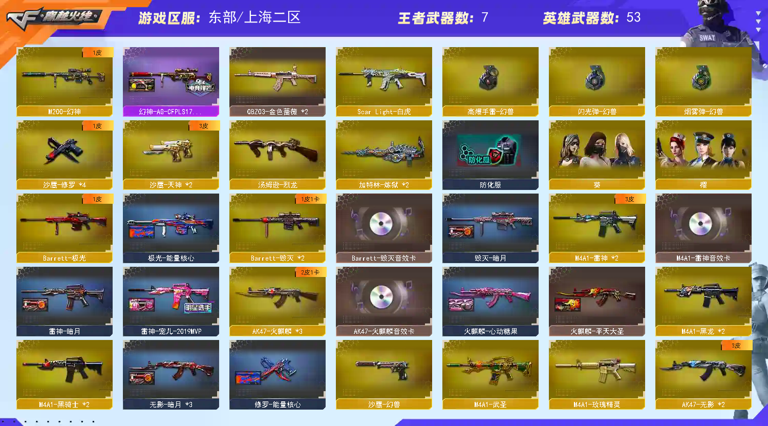东部⭐m200幻神+ag冠军皮肤⭐白虎 qbz03金色蔷薇*2 雷神+雷神音效卡+宠儿皮肤⭐4防经理