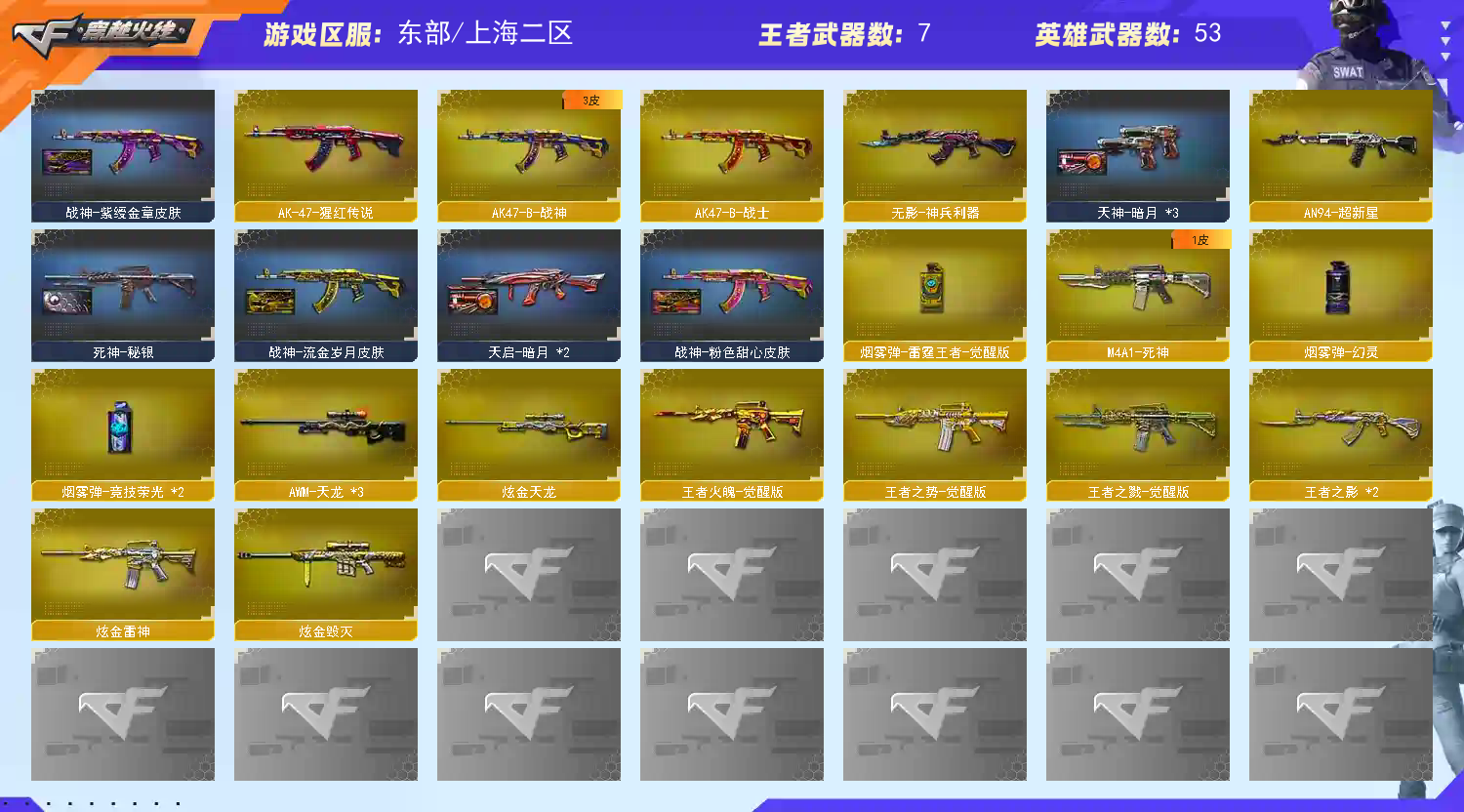 首页 > 租号大厅 > 穿越火线 > 东部/上海二区 > 东部⭐m200幻神+ag冠军皮肤⭐白虎 qbz03金色蔷薇*2 雷神+雷神音效卡+宠儿皮肤⭐4防经理