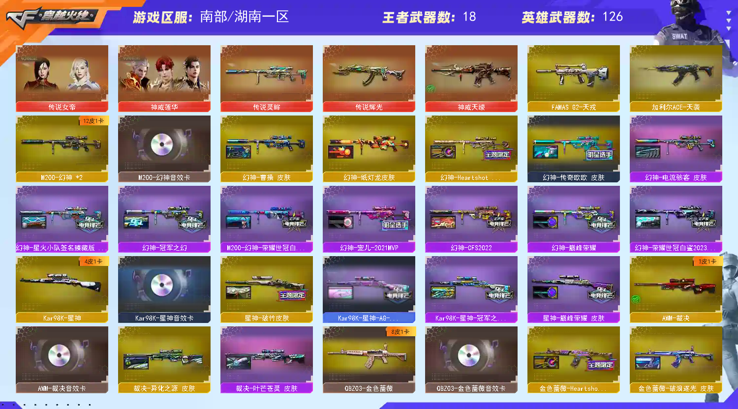 神威天绫/传说辉光/传说灵眸/幻神Heartshot /幻神电流骇客 /幻神纸灯龙/幻神星火小队/幻神传奇欧欧 /幻神世冠白鲨/幻神荣耀世冠白鲨2023 /幻神宠儿/幻神冠军之幻/幻神巅峰荣耀/传说女帝 神威莲华 鹰/电竞教官-云悠悠/关小雨/兰-巾帼英雄/隼/M200-幻神(2)/M200-竞技荣光/Barrett-毁灭(3)/Barrett-极光/Barrett-暗月传说/竞技荣光套装/荣耀世冠套装/M200-幻神音效卡/Kar98K-星神音效卡/QBZ03-金色蔷薇音效卡/Scar Light-白虎音效卡/M4A1-雷神音效卡/M4A1-黑骑士音效卡/M4A1-黑龙音效卡/AK47-火麒麟音效卡/死神-雪域霜狐-怀旧音效卡/烈火-动感闪耀 音效卡/Barrett-毁灭音效卡/AWM-裁决音效卡/Barrett-碧霄极光音效卡/天神-动感闪耀 音效卡/炼狱-百战金芒-庆典舞曲音效卡/加特林-炼狱音效卡/屠龙-动感闪耀 音效卡 账号租借时间快到请不要继续开排位! 严禁鼠标宏!严禁外挂!开挂追责,科技大佬勿扰,谢谢。;柯尔特-无冕之王,USP-雷暴王者,荣耀世冠-柯尔特,柯尔特-冠军之特,炽芒蝶刃,Knife-冠军之刃,传说女帝,
