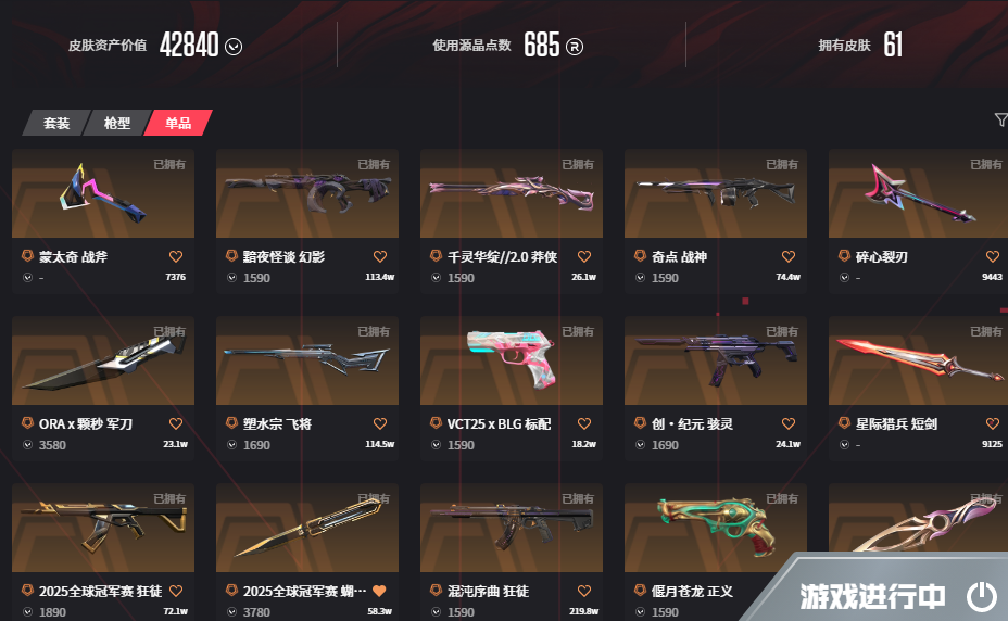 首页 > 租号大厅 > 无畏契约-wegame > wegame/wegame > 可排位❤25冠军套/颗秒套❤落英刀❤25冠/混沌/盖亚紫金颗秒❤侦察暗夜幻影❤猫猫鬼魅