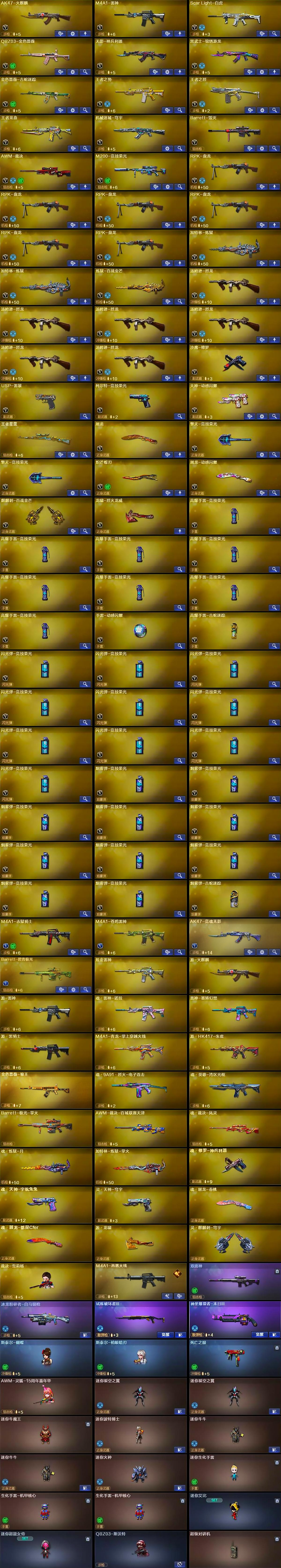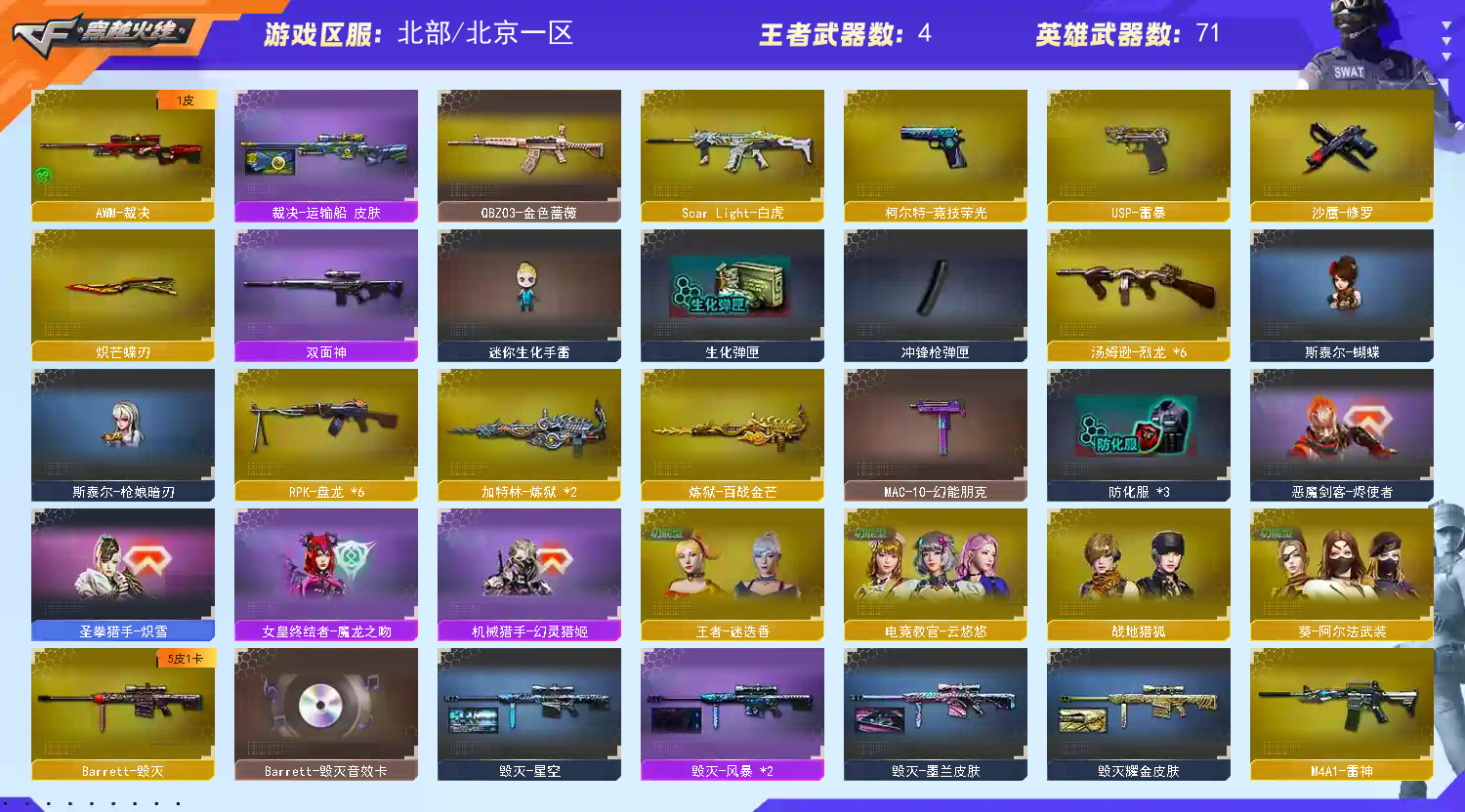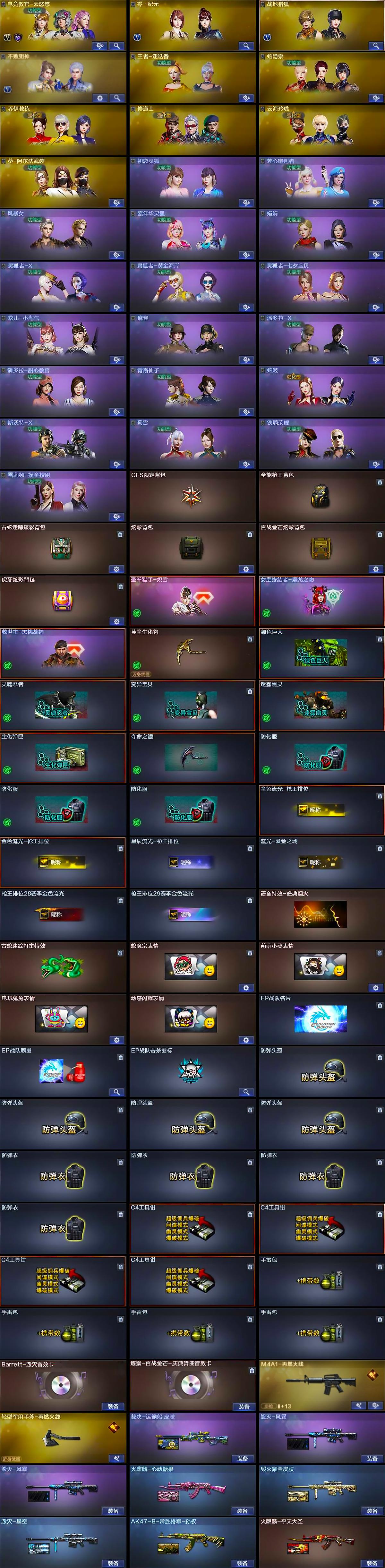 【英雄级武器】:AK47-火麒麟/AWM-裁决/Barrett-毁灭/炽芒蝶刃/加特林-炼狱(2)/柯尔特-竞技荣光/M4A1-雷神/M200-竞技荣光/擎天-竞技荣光(2)/RPK-盘龙(6)/沙鹰-修罗/汤姆逊-烈龙(6)/屠龙/USP-雷暴/ScarLight-白虎/无影-神兵利器/黑武士-锦绣游龙/金色蔷薇-古蛇迷踪/QBZ03-金色蔷薇/王者之势-觉醒版/王者之烈-觉醒版/王者龙血-觉醒版/炼狱-百战金芒/天神-动感闪耀/屠龙-动感闪耀/麒麟刺-百战金芒/高爆手雷-竞技荣光(8)/手雷-动感闪耀/高爆手雷-古蛇迷踪/闪光弹-竞技荣光(10)/烟雾弹-竞技荣光(10)/烟雾弹-古蛇迷踪/M4A1-赤狱骑士/M4A1-苍鸣雷神/Barrett-碧霄极光 【王者炫金武器】:王者星霆/炫金雷神 【音效卡】:Barrett-毁灭音效卡/炼狱-百战金芒-庆典舞曲音效卡 【皮肤】:火麒麟-平天大圣/火麒麟-心动糖果/毁灭耀金皮肤/毁灭-星空/毁灭-风暴(2)/裁决-运输船皮肤/M4A1-再燃火线/AK47-B-常胜将军-孙权/轻型军用手斧-再燃火线 【道具】:CFS限定背包/全能枪王背包/古蛇迷踪炫彩背包/炫彩背包/百战金芒炫彩背包/虎牙炫彩背包/圣拳猎手-炽雪/女皇终结者-魔龙之吻/救世主-黑桃战神/黄金生化钩/绿色巨人/灵魂忍者/变异宝贝/迷雾幽灵/生化弹匣/夺命之镰/防化服(3)/金色流光-枪王排位(2)/星辰流光-枪王排位/流光-鎏金之域/枪王排位28赛季金色流光/枪王排位29赛季金色流光/语音特效-盛典烟火/古蛇迷踪特效/蛇隐宗表情/萌萌小葵表情/电玩兔兔表情/动感闪耀表情/防弹头盔(4)/防弹衣(4)/C4工具钳(4)/手雷包(4) 【人偶武器】:AWM-灵狐-15周年嘉年华/迷你裂空之翼(2)/迷你牛魔王/迷你波特博士/迷你牛牛(2)/迷你火种/迷你生化手雷/迷你艾比/迷你超能女侍/斯泰尔-蝴蝶/生化手雷-机甲核心(2)/裁决-雪莉杨 【暴走生化】:死亡之眼/双面神 【挑战大师】:冰龙粉碎者-白马银枪/试炼破坏者III/神圣爆裂者-末日III 【角色】:电竞教官-云悠悠/青霞仙子/蜀雪/铁骑荣耀/王者-迷迭香/战地猎狐/蛇隐宗/乔伊教练/修道士/云海玲珑/初恋灵狐/芳心审判者/风暴女/嘉年华灵狐/娟娟/兰-新年限定/灵狐者-X/灵狐者-黄金海岸/灵狐者-七夕宝贝/龙儿-小淘气/麻雀/潘多拉-X/潘多拉-甜心教官/蛇姬/斯沃特-X/兔囡囡/雪莉杨-摸金校尉;USP-雷暴,炽芒蝶刃,电竞教官-云悠悠,RPK-盘龙,QBZ03-金色蔷薇,Scar Light-白虎,