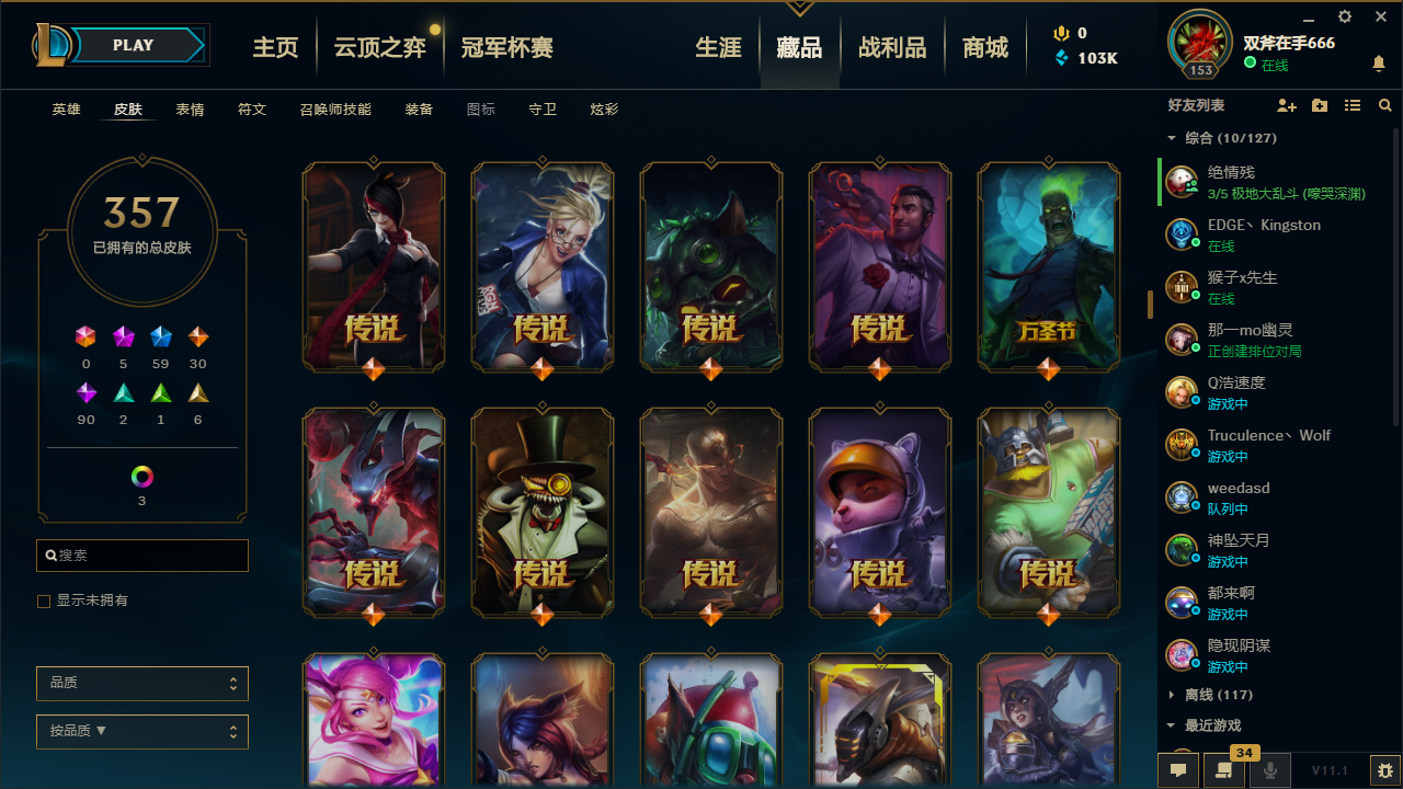 【德玛西亚】168英雄411皮肤,摄魂薇恩,恐惧新星德莱厄斯,海克斯安妮,暗杀星(蒙多,努努,慎,)电玩女神厄运小姐,冠军典狱长锤石,冠军之矛卡莉斯塔,勇者阿狸,勇敢的心德莱厄斯,泳池派对男枪,泳池派对鳄鱼,SSW辛吉德,SSW图奇,SKT1(阿利斯塔,卡莉斯塔,雷克顿,瑞兹,伊丽丝,)神拳李青